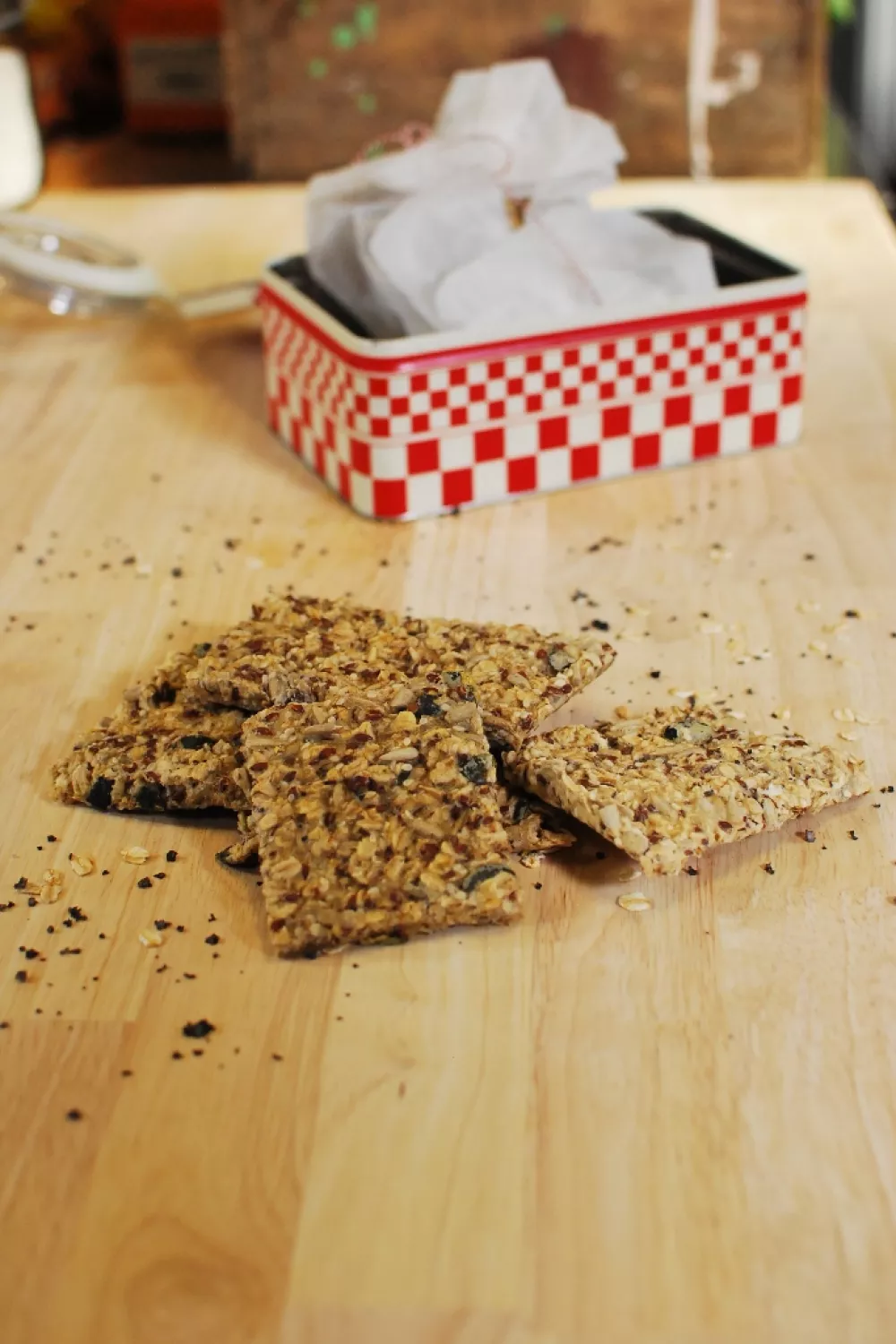 Dit knäckebröd is een knapperige, hartige cracker van spelt en havermout, verrijkt met zonnebloem- en pompoenpitten, gebroken lijnzaad en sesam voor extra smaak en textuur. Eenvoudig ovengebakken met water, olijfolie en een snuifje zout, ideaal als gezonde snack, ontbijtcomponent of bij een lunchplank in elk seizoen. Vezelrijk en lang houdbaar, perfect om vooraf te bakken en mee te nemen.