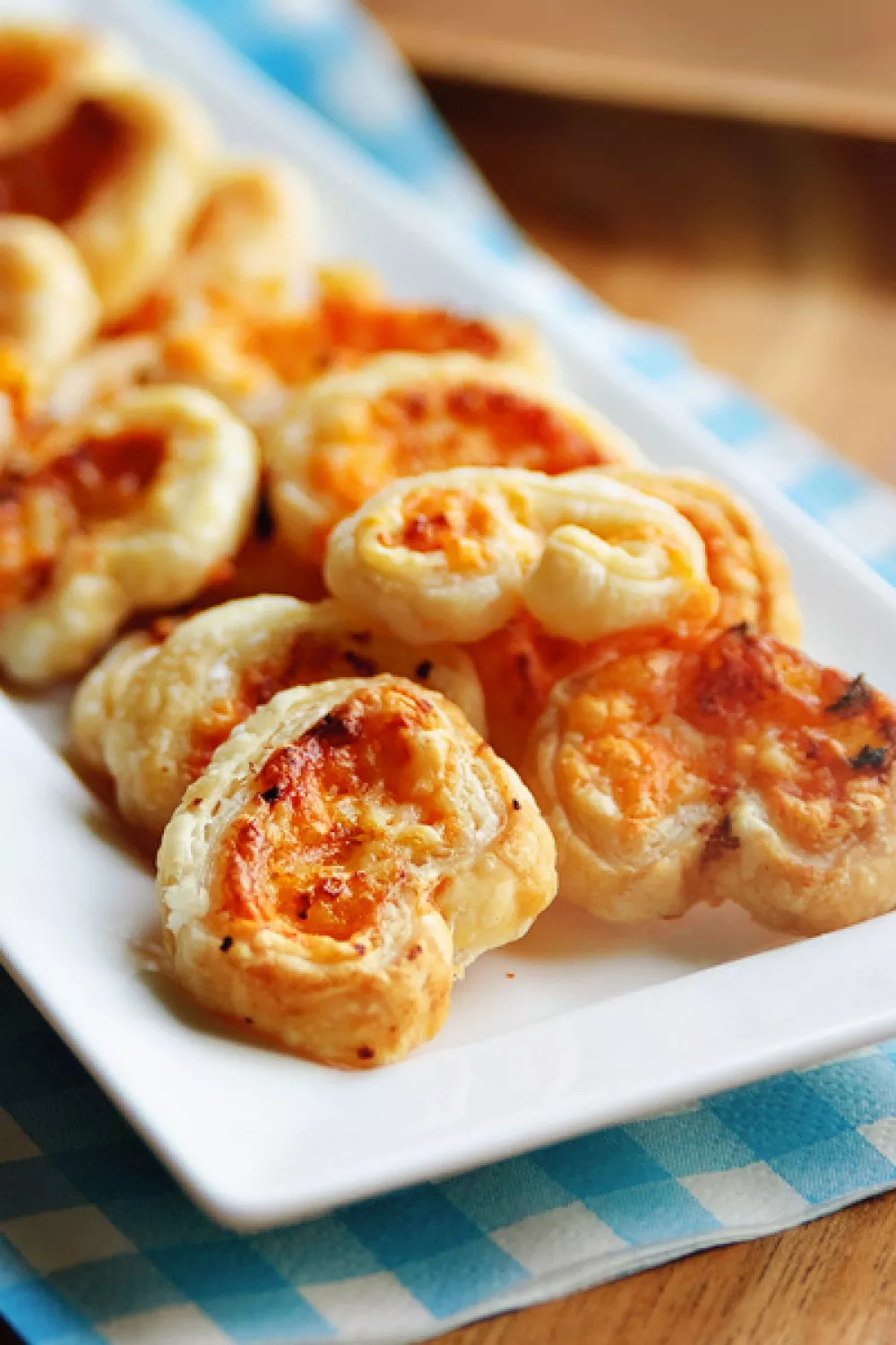Knapperige kaaskoekjes met geraspte pittige kaas en ui, gemaakt van luchtig bladerdeeg en krokant gebakken in de oven. Deze kaasvlinders zijn ideaal als borrelhapje of aperitief bij een feestje of winterse borrel. Een dun laagje eiwit geeft glans en een likje pesto zorgt voor een frisse smaakboost.