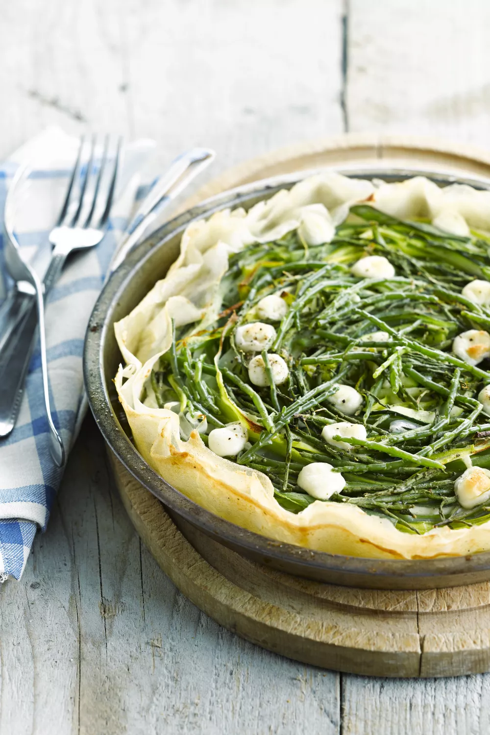 Knapperige lentetaart met filodeeg en een romige vulling van ricotta en mascarpone, verfrist door prei, julienne courgette, snijbonen en ziltige zeekraal. De bodem wordt kort voorgebakken en de groenten licht geblancheerd zodat de taart in de oven goudbruin en knapperig blijft. Met verse oregano, munt en mini mozzarella is dit voorjaarsgerecht ideaal als lichte lunch, picknick of borrelhap.
