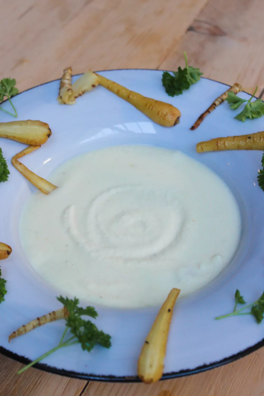 Roer net voor het serveren nog wat zure room door de soep. Schenk de soep vervolgens in een diep bord. Schik de mini-pastinaakjes mooi op de rand van het bord. Werk de soep af met een takje peterselie.