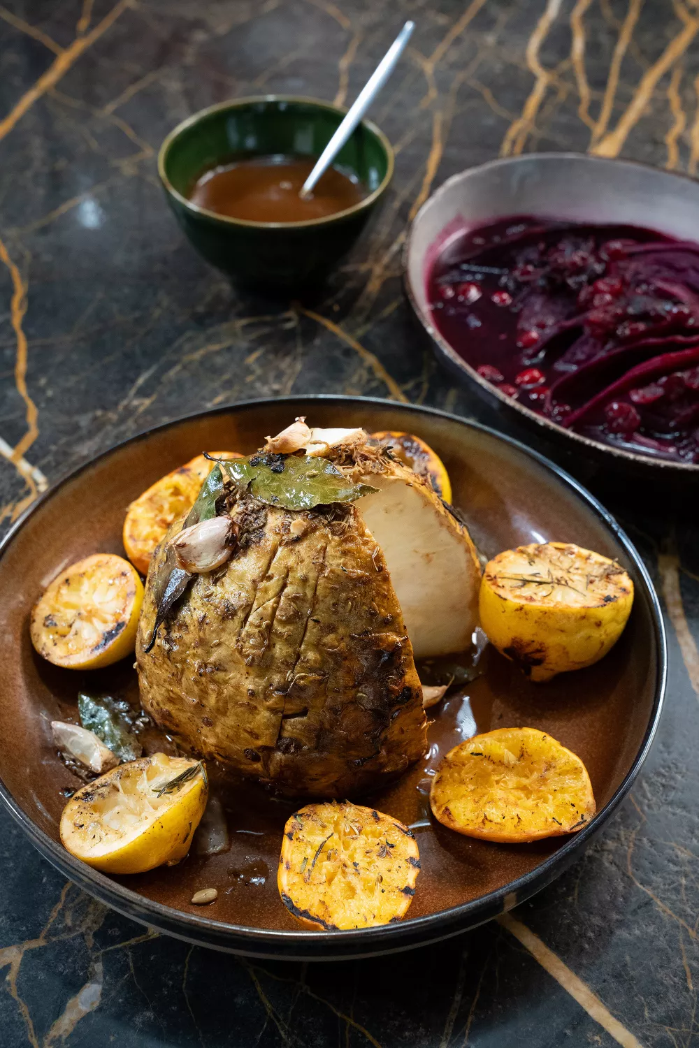 Langzaam geroosterd knolseldergebraad met gekarameliseerde rode kool en een rijke vegan bruine saus verenigt hartige, kruidige en lichtzoete tonen. Venkelzaad, fenegriek en gegrilde citroen geven het ovengerecht karakter terwijl veenbessen en azijn de rode kool diepte en frisheid geven, ideaal voor een herfstig of winters plantaardig feestmaal. De techniek van langzaam roosteren en het inkoken van een umami saus van de groenteresten zorgt voor een vol en huiselijk gerecht.