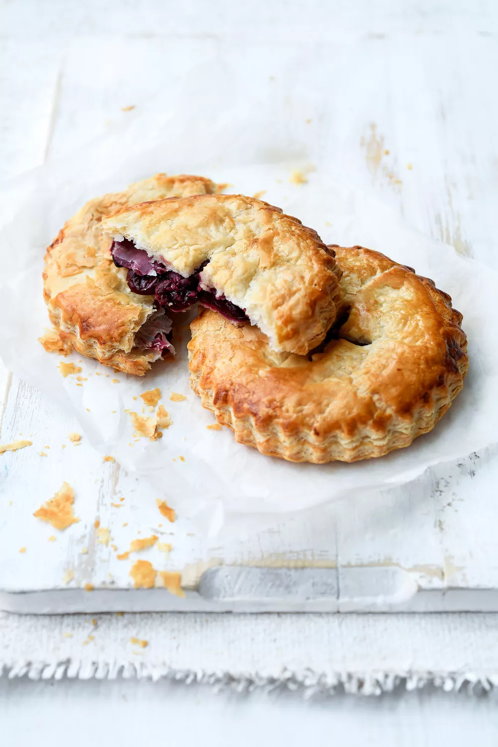 Steek 8 grote cirkels uit bladerdeeg en leg 4 cirkels op een bakplaat met bakpapier. Schep er wat van het kriekenmengsel op en leg er opnieuw een rondje bladerdeeg op. Druk de randen goed aan en snijd een kruisje in het midden.
