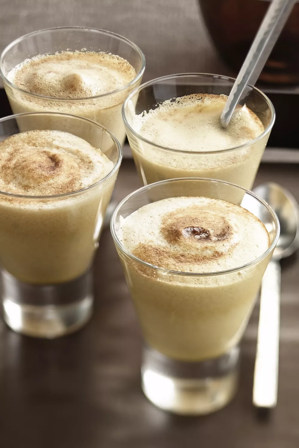 Luchtige koffiesabayon met marsala en munt is een elegant dessert waarin romige eierdooiers, fijne suiker en oploskoffie samenkomen met een vleugje kaneel. Au bain marie zorgvuldig opgeklopt tot een zijdezachte, schuimige sabayon en op het laatste moment verfrist met fijngesnipperde muntblaadjes. Bestrooid met cacaopoeder is het ideaal als feestelijk nagerecht of bij een gezellige koffieborrel in alle seizoenen.