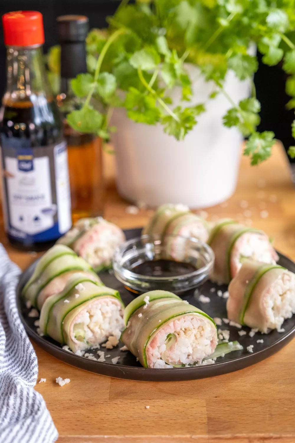 Zomerse komkommersushi met flinterdunne linten komkommer, zachte sushirijst en dunne plakjes rosbief, afgewerkt met pittige wasabi-mayonaise en krokante panko. Deze frisse borrelhap combineert Japanse technieken zoals rijst op smaak brengen met rijstazijn en strak oprollen in folie met rosbief voor een verrassende lichte lunch of aperitief. Serveer met sojasaus om in te dippen.