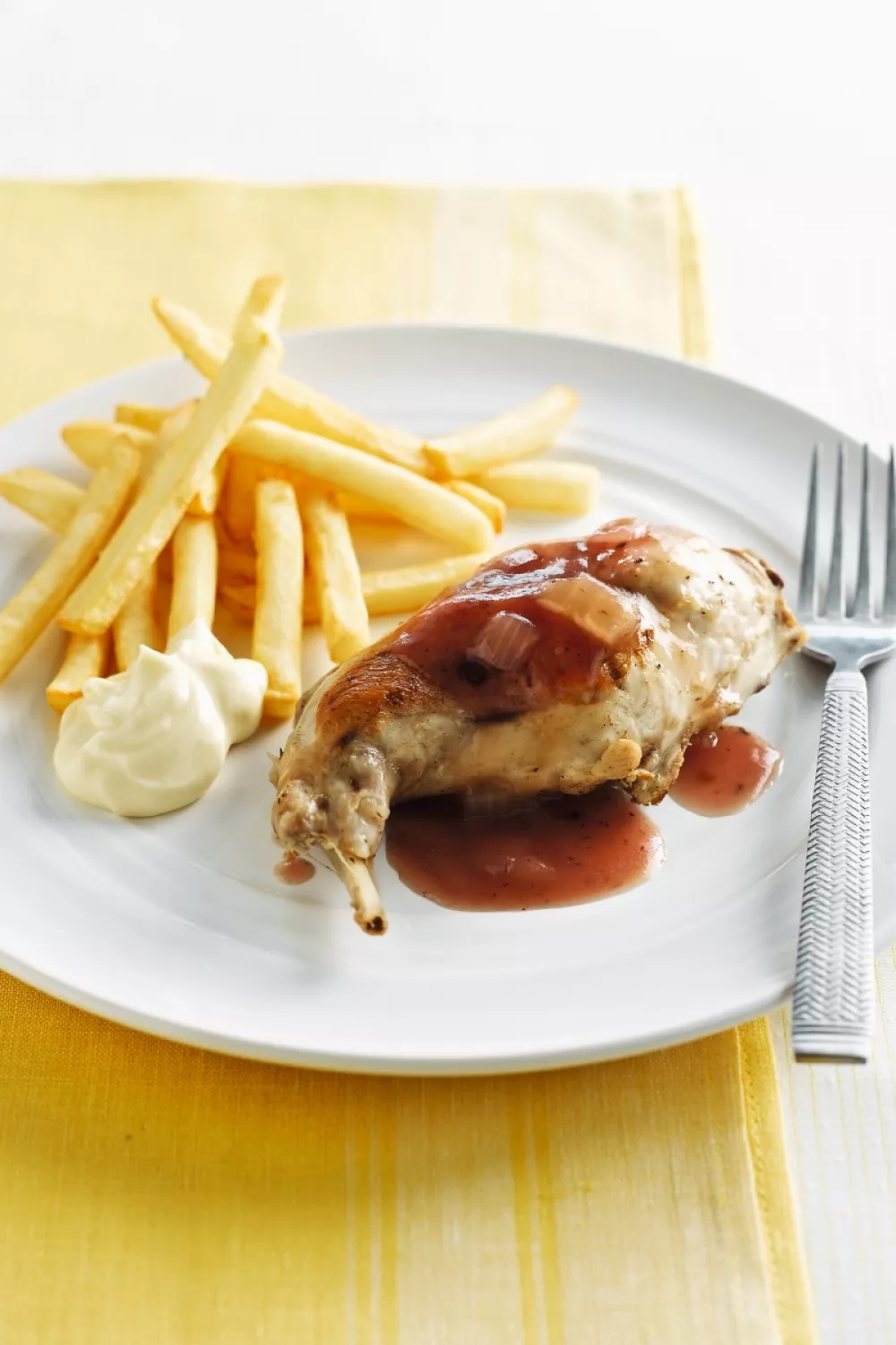 Dien op met frietjes, sla, tomaat en zelfgemaakte mayonaise.