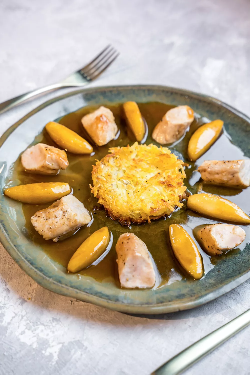 Dit feestelijke, rustieke gerecht combineert malse konijnfilets met gekaramelliseerde appeltjes en knapperige aardappelrösti voor een warme herfst of wintermaaltijd. De konijnfilets worden kort aangebraden en rustig verder gegaard onder een deksel, terwijl appels met boter en suiker samen met bier, bruine kalfsfond en appelciderazijn worden ingekookt tot een rijke, glanzende saus. Krokante rösti gekruid met nootmuskaat en een vleugje zout maken het geheel af en geven dit klassieke bistrogerecht net dat tikkeltje extra voor een gezellig diner.