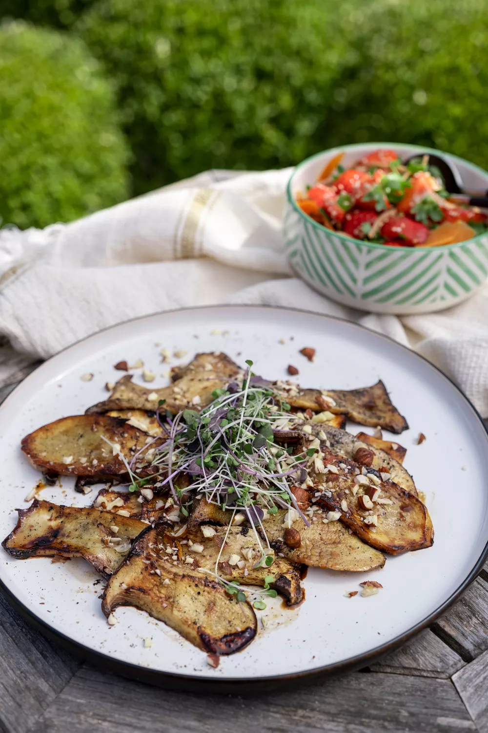Een zomerse, lichte maaltijd waarin gegrilde koningsoesterzwammen met een zoetzoute gemberdressing samenkomen met volkorenpasta, courgetti en frisse wortel- en aardbeiensliertjes. De paddenstoelen krijgen een karamelachtige lak van sojasaus en ahornsiroop op de plancha of bbq en de Aziatisch geïnspireerde dressing van rijstazijn en gember maakt het geheel fris en pittig. Sesamzaadjes, lente-ui en fijngehakte hazelnoten zorgen voor knapperigheid, ideaal als doordeweeks diner of als bijgerecht bij een zomerse barbecue.