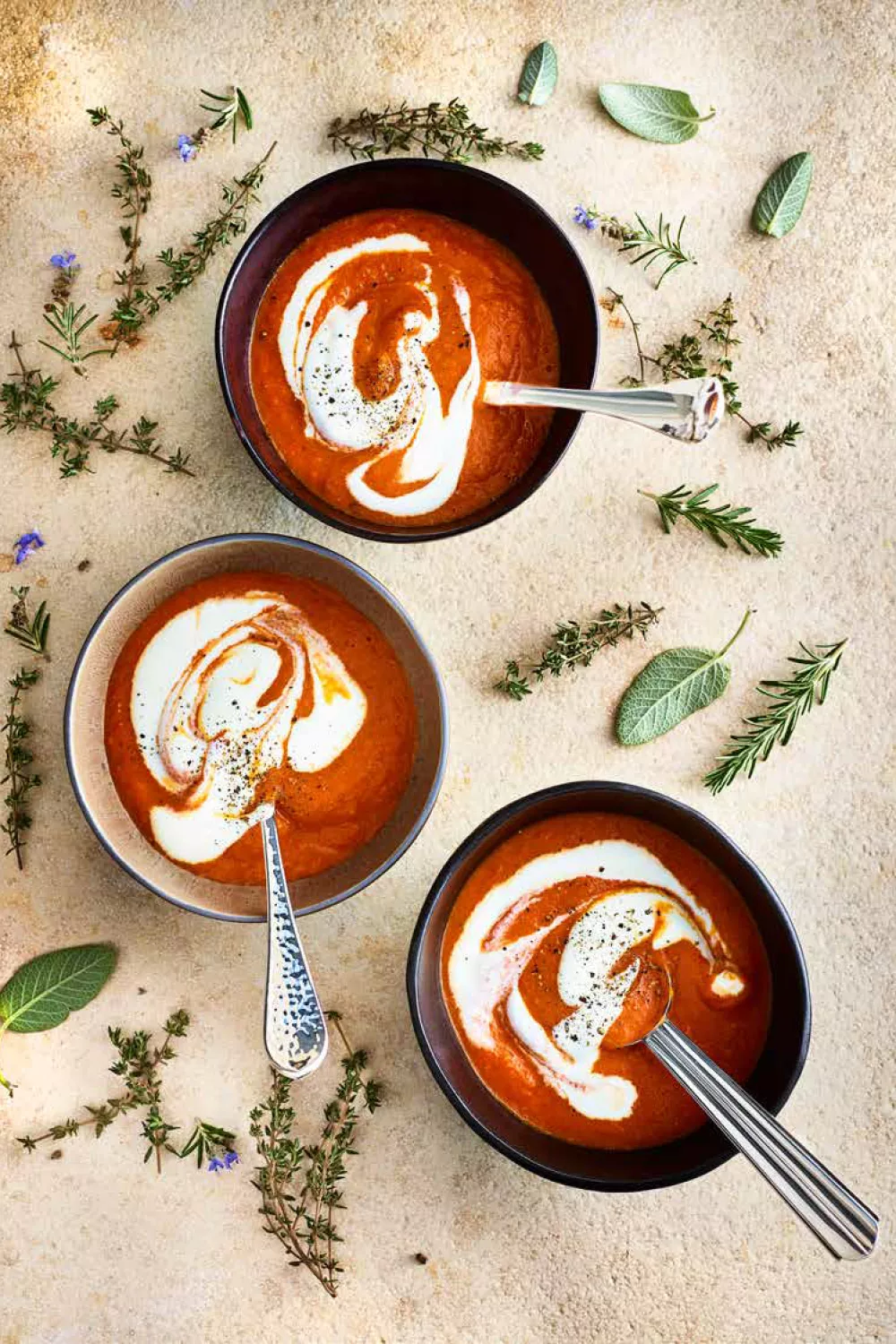 Een frisse koude geroosterde groentesoep vol zonrijpe tomaten, puntpaprika en knapperige komkommer met een warme hint van gember en chili. Het ovenroosteren concentreert de smaken terwijl bruisend mineraalwater en witte balsamico zorgen voor een luchtige, zomerse textuur. Serveer licht gekoeld met een lepel yoghurt als lichte lunch of elegant voorgerecht bij warme dagen.