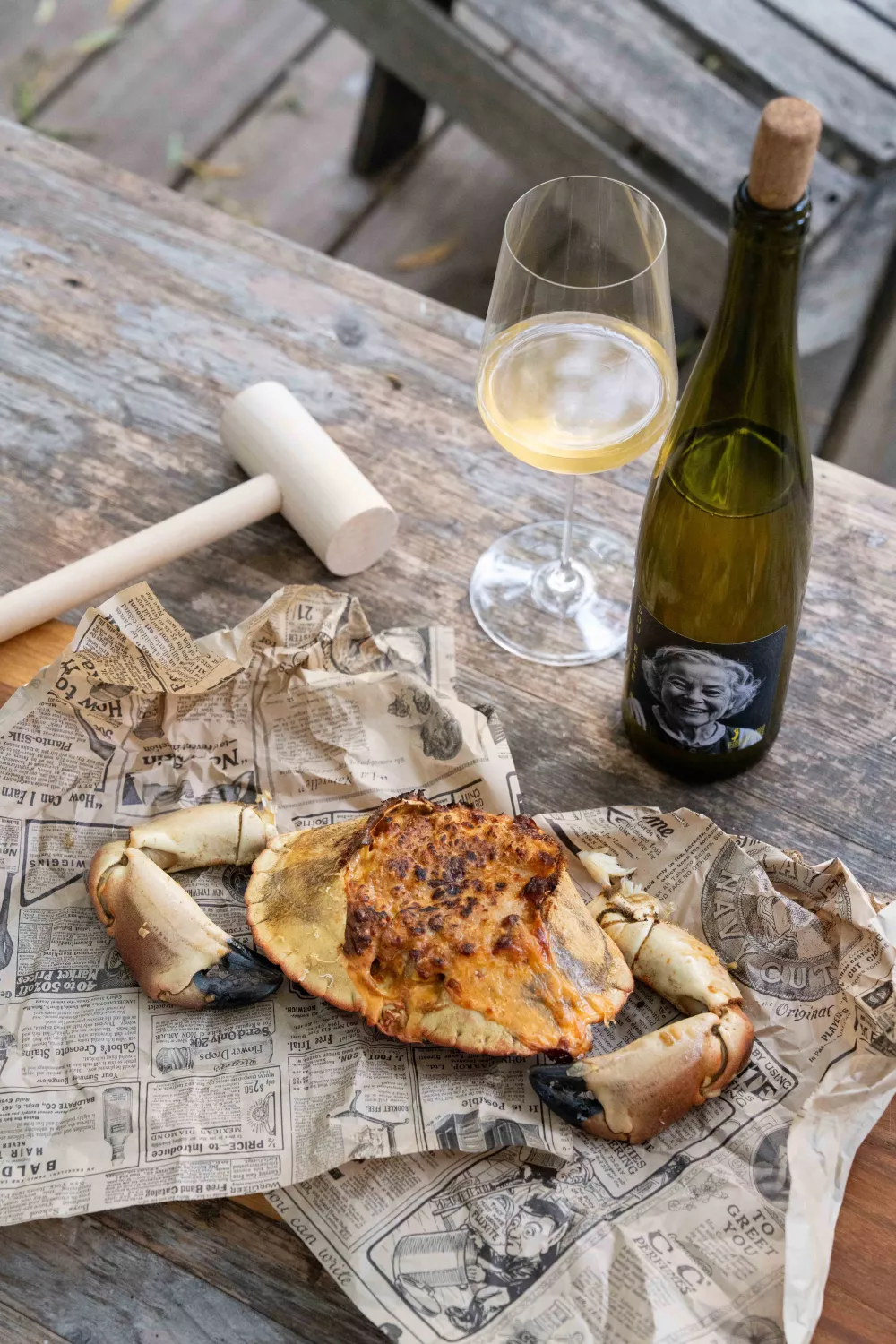 Serveer de gevulde krabbenkoppen samen met de gegrilde poten.