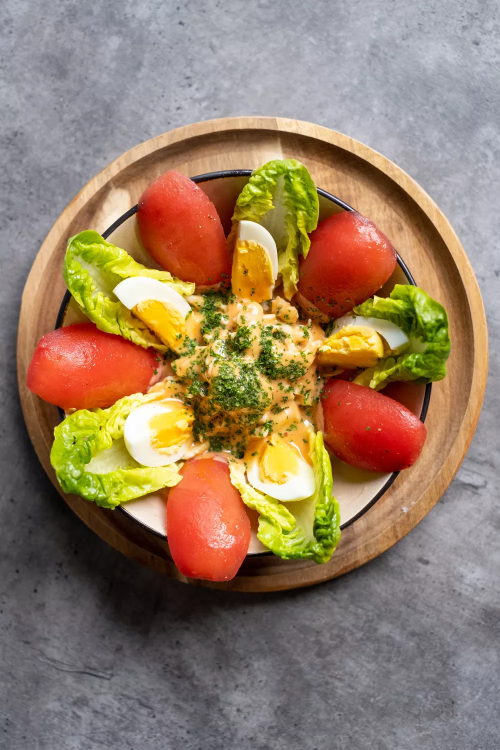 Frisse krabcocktail als elegant voorgerecht met sappige romatomaten, knapperige slaharten, zachte partjes hardgekookt ei en royaal kingkrabvlees. Zelfgemaakte cocktailsaus van eidooiers, mosterd en zonnebloemolie krijgt een verrassende twist door whiskey en ketchup. Perfect voor een zomerse lunch of feestelijk aperitief en eenvoudig te bereiden dankzij emonderen van tomaten en het emulgeren van de mayo.