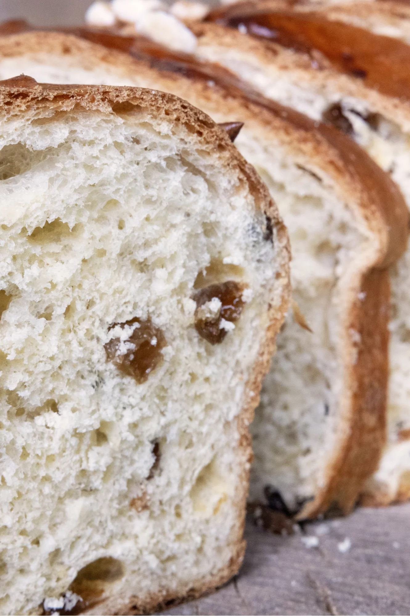 Rek en vouw je deeg 1 keer. Laat het deeg ongeveer 3 uur rijzen tot het deeg bijna verdubbeld is in volume. Verdeel het deeg in twee stukken en vorm het. Leg het in een ingevet bakblik. Laat 2 uur 30 minuten narijzen. Doreer met een ei en snijd een kruis op de bovenkant van het deeg. Versier met parelsuiker en bak 25 minuten op 150 °C. Zorg voor voldoende stoom tijdens het bakken.