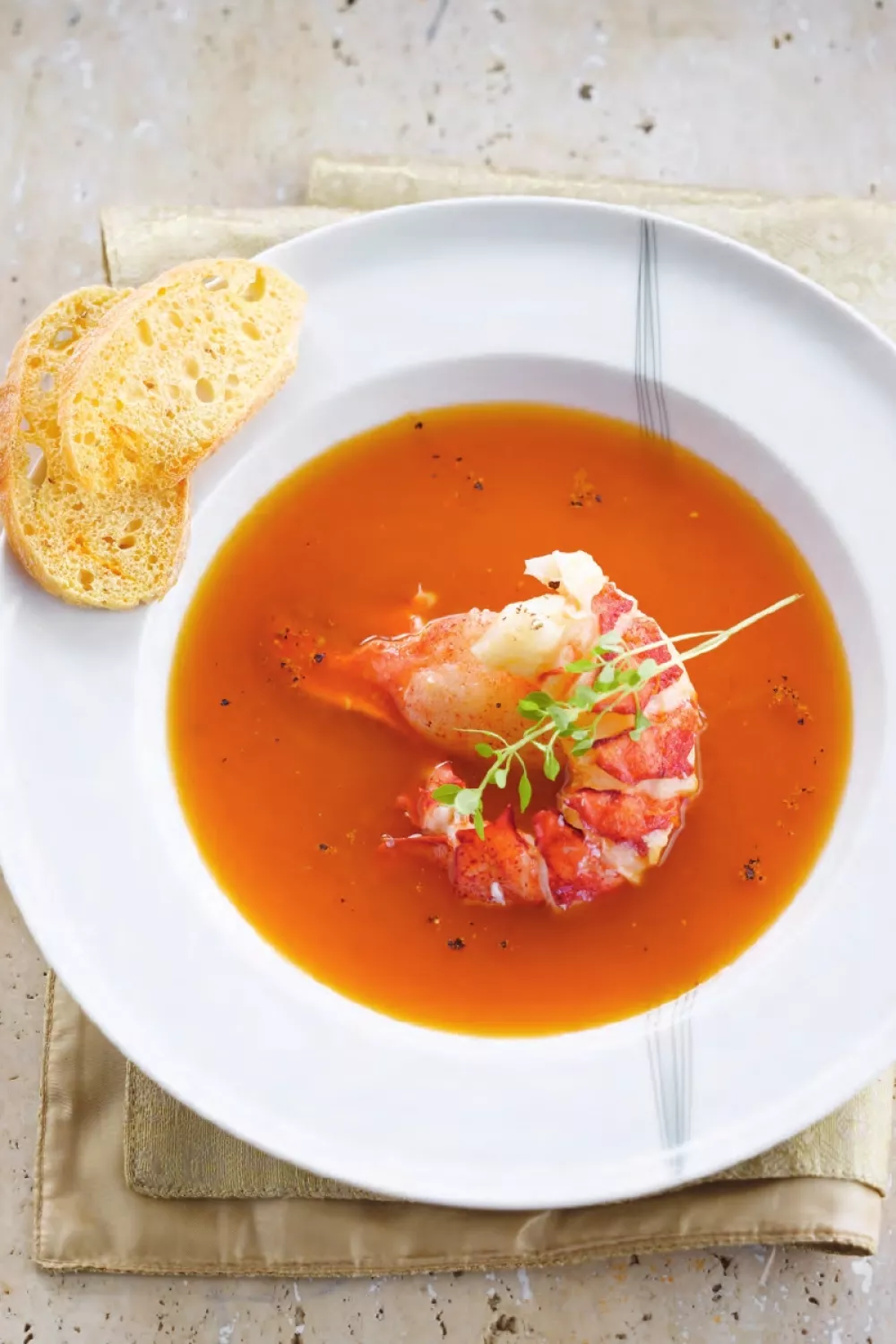 Leg de stukjes kreeft nog enkele minuutjes in de hete soep. Serveer de bisque met toast.