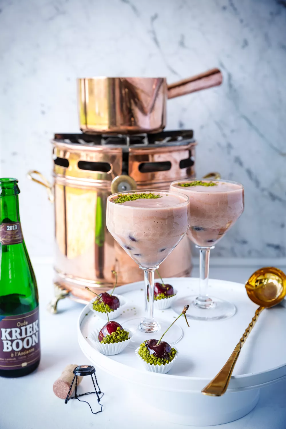 Luchtige kriekensabayon brengt warme, schuimende textuur samen met de fruitige diepte van kriekenlambiek en een subtiele maraskinosmaak. Op zachte warmte worden romige eierdooiers en kristalsuiker opgeklopt tot een zijdezacht schuim, perfect als feestelijk dessert of als verfijnde cocktailgarnituur in lente en zomer. Afgewerkt met geraspte kokos, krokante pistachenoten en met isomalt geglazuurde kersen is het zowel smaakvol als oogstrelend.