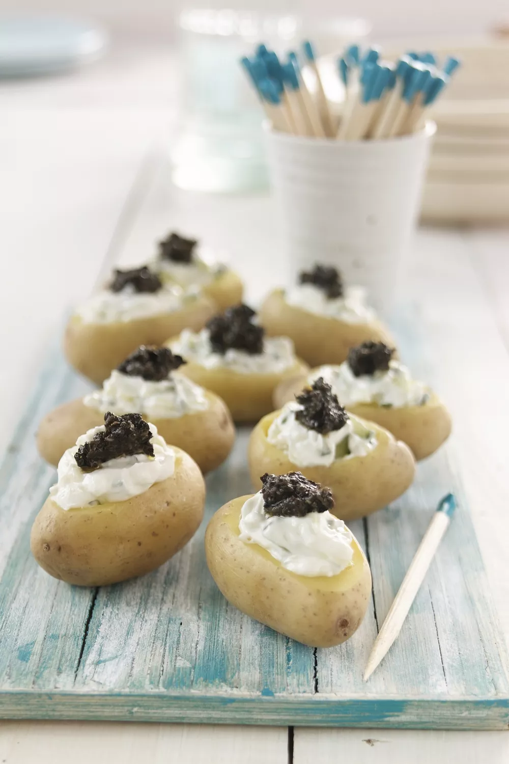 Snijd een hoedje af van de aardappeltjes en hol ze tot de helft uit. Vul met de tzatziki en werk af met de tapenade.