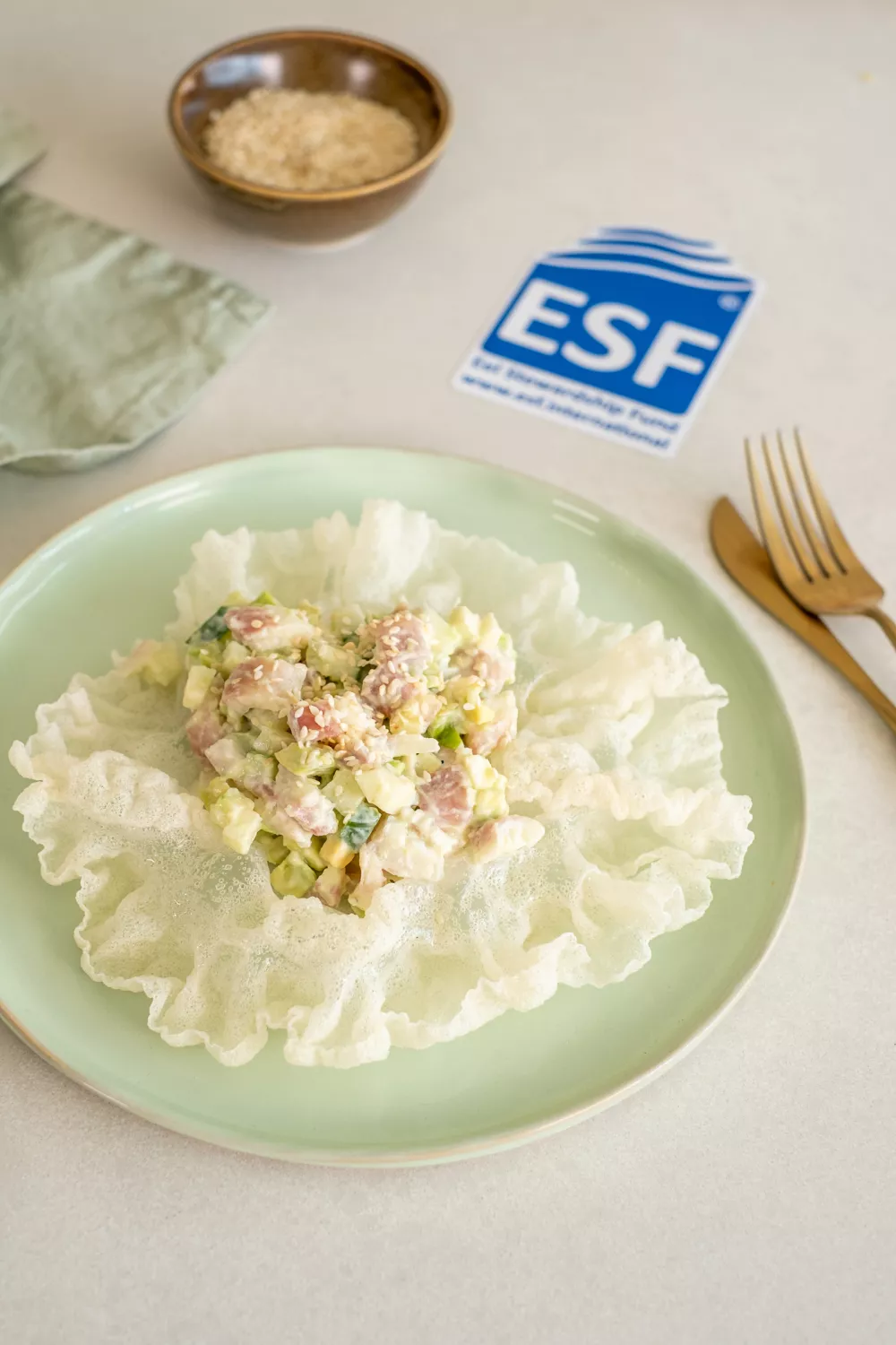 Vul elke kroepoek van rijstpapier met enkele lepels van de tartaar. Werk af met sesamzaadjes.