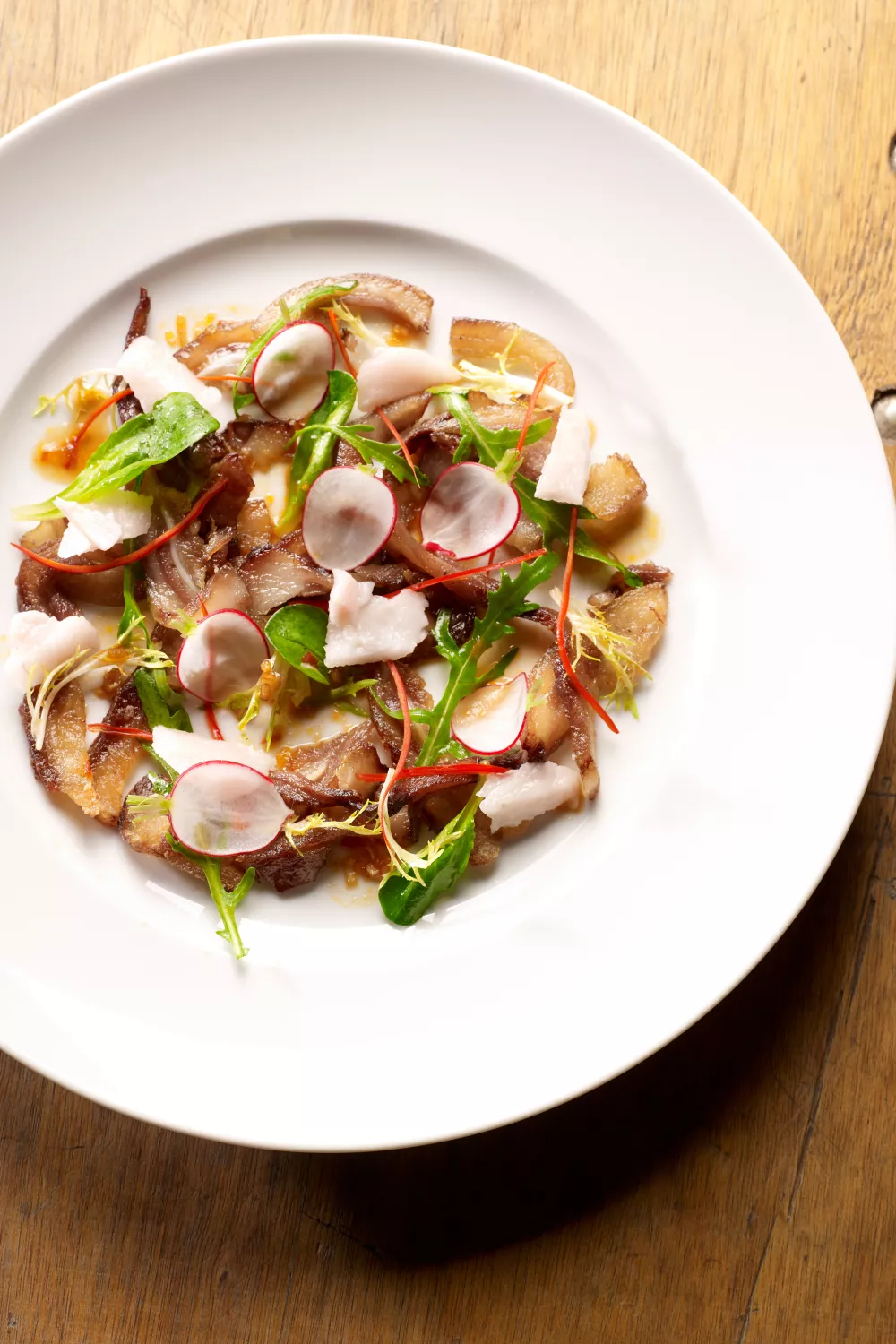 Krokant gebakken varkensoor met een frisse salade van rucola en kropsla combineert langzaam gegaarde malsheid met een knapperige bite. Na uren zachtjes koken worden de oren in olie krokant gebakken en afgerond met sojasaus, mirin en limoen voor umami en een frisse toets. Perfect als verrassend borrelhapje of lichte hoofdschotel bij een informeel diner.