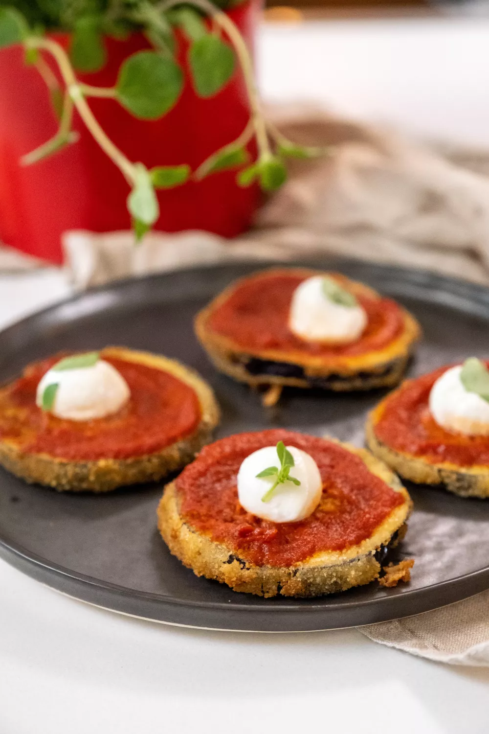 Krokant gebakken aubergineschijfjes met een romig mozzarellabolletje en een smeuïge laag Pomo e legumi brengen Italiaanse smaken naar je borrel of lichte maaltijd. De aubergine krijgt een klassieke paneerlaag van bloem, ei en paneermeel en wordt goudbruin in olijfolie voor een knapperige bite. Werk af met verse basilicum en serveer warm als zomerse snack, vegetarisch voorgerecht of bij een gezellig etentje.