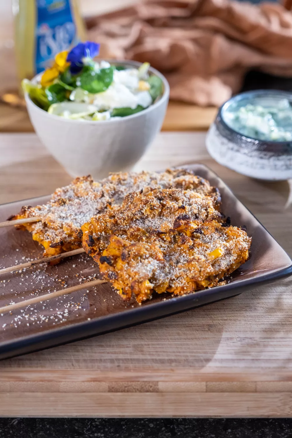 Deze krokante falafelsaté van zoete aardappel en kikkererwten brengt zachte zoetheid samen met hartige tahini en een knapperig paneermeelkorstje, ideaal als vegetarische lunch of zomerse borrel. Ovengebakken satés worden verfrist door een groene tzatziki van komkommer, kervel en Griekse yoghurt. Serveer met veldsla, witloof, geroosterde pijnboompitten en feta voor een licht mediterraan geheel.