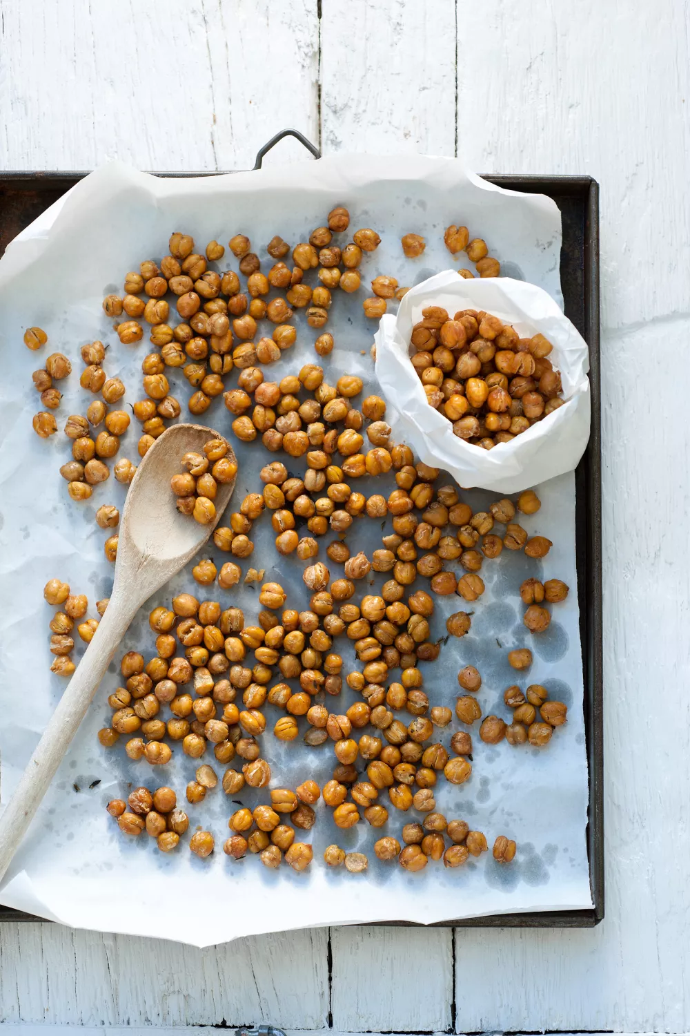 Stort de kikkererwten uit op een met bakpapier beklede bakplaat en plaats deze gedurende 40 minuten in een voorverwarmde oven van 180 graden.