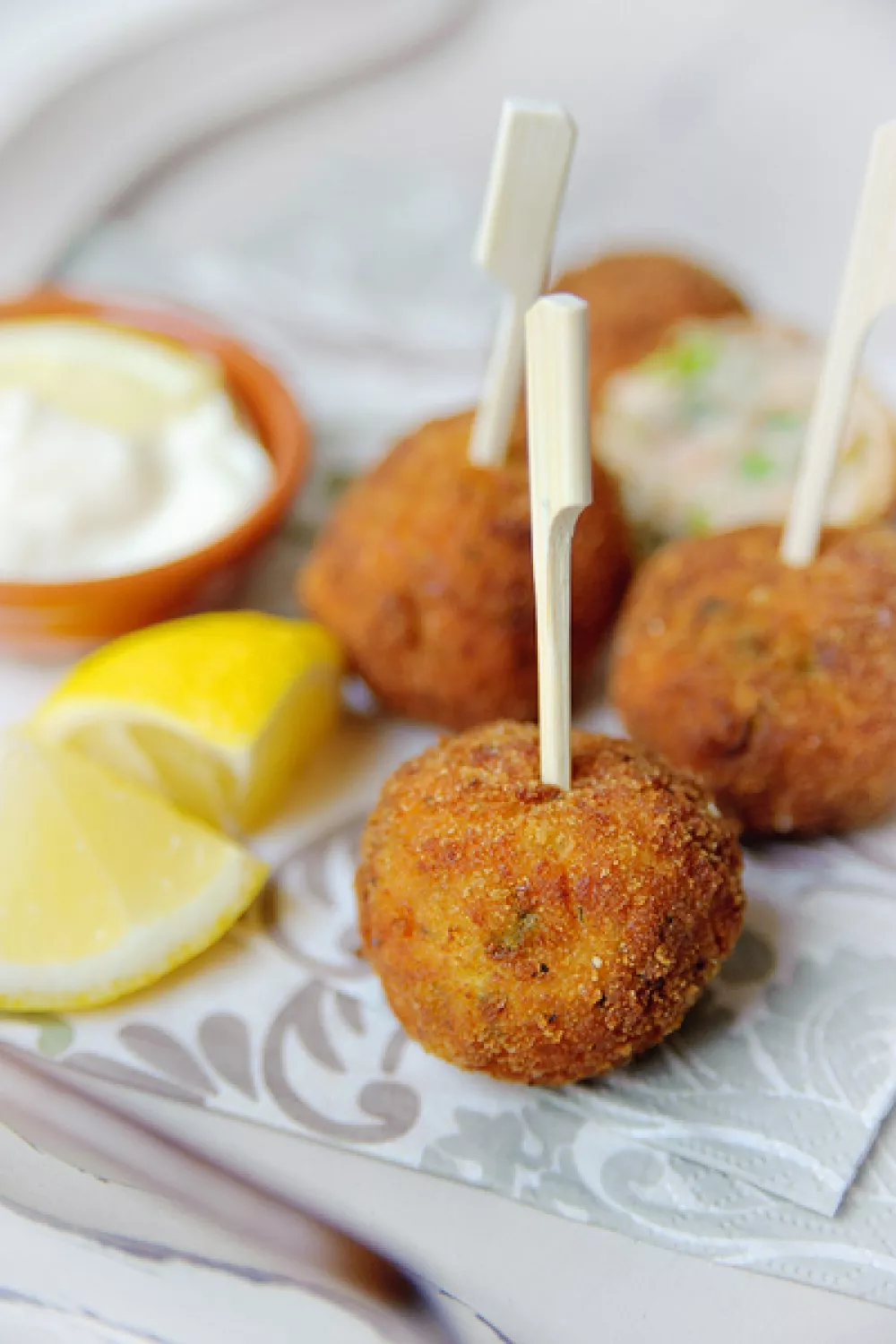 Deze krokante zalmballetjes met aardappelpuree, doperwten, lenteuitjes, dille en peterselie zijn een ideaal borrelhapje, tapas of buffetgerecht voor elk seizoen. Eerst laten opstijven, dan dubbel paneren in broodkruim en kort frituren tot goudbruin voor een extra knapperige korst. Serveer als fingerfood met citroenmayonaise voor een frisse toets.