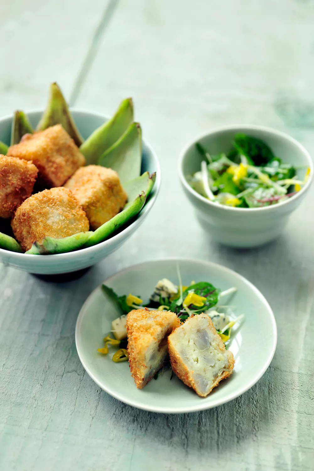Fluweelzachte kroketjes van artisjok en bloemige aardappel, met een knapperig paneerlaagje en een hartige toets van blauwe kaas. De artisjokken worden zacht gestoofd met tijm en salie, vermengd met romige puree, gekoeld en vervolgens gepaneerd en gefrituurd tot goudbruin. Serveer warm op een frisse salade van molsla, rode zuring en tuinkers als borrelhap of licht voorgerecht in lente en zomer.