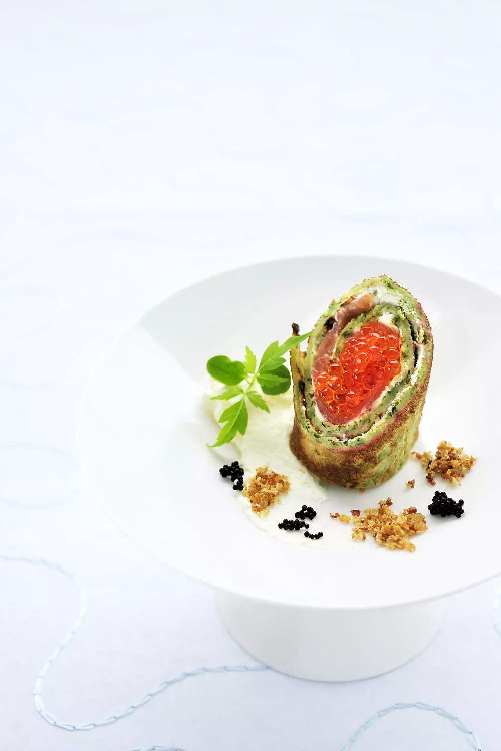 Luchtige, dunne kruidenpannenkoekjes gevuld met romige zure room, gerookte zalm en een fris kruidenspel van peterselie, dille en basilicum. Kort gebakken en strak opgerold waarna ze even koelen zodat je stijlvolle rolletjes krijgt die perfect passen bij een borrel, brunch of feestelijke lunch. Afgewerkt met zalmeitjes en extra kruiden voor een zoute en frisse smaakbalans.
