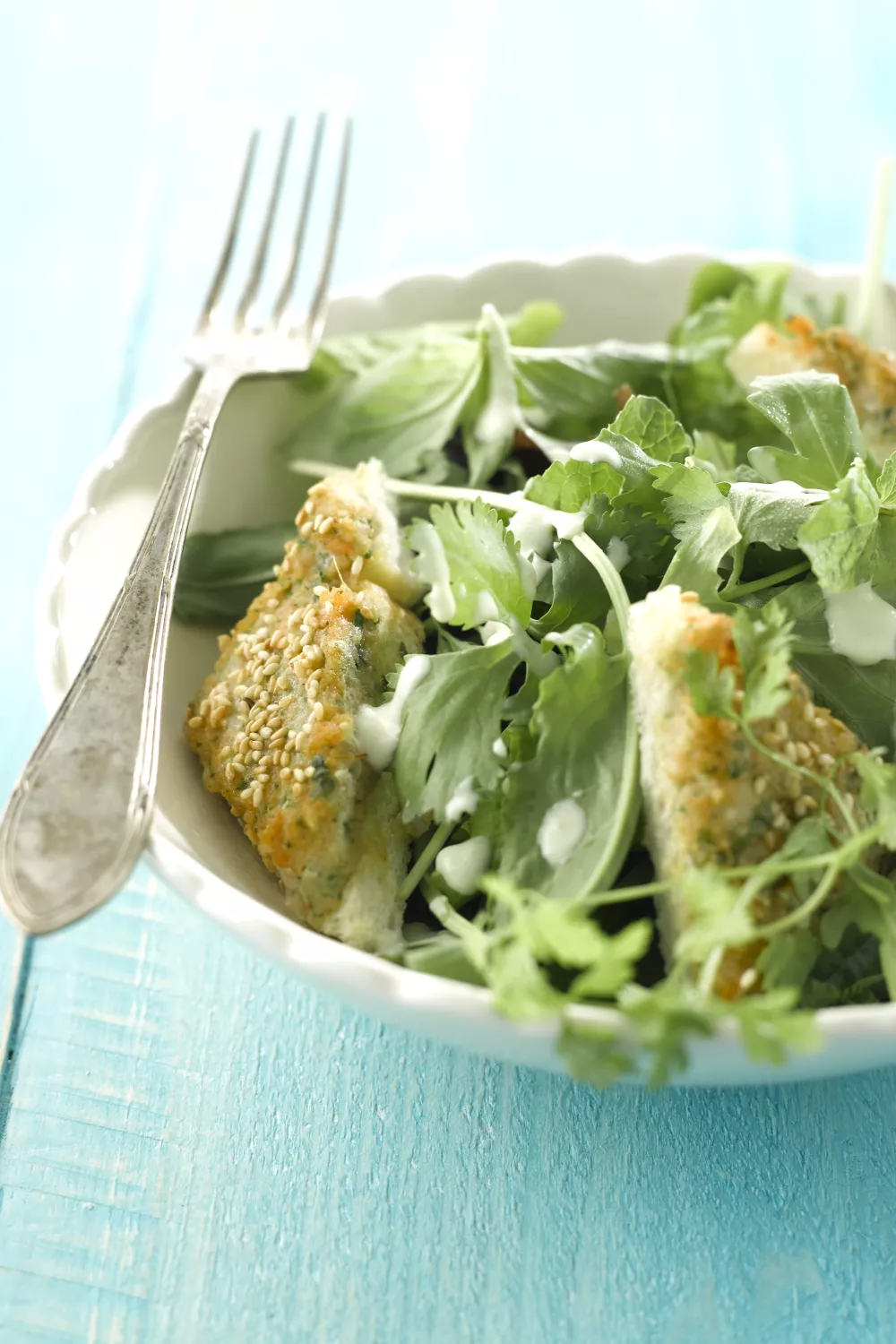 Meng de kruidensalade met de avocadodressing en serveer met de garnalentoastjes.
