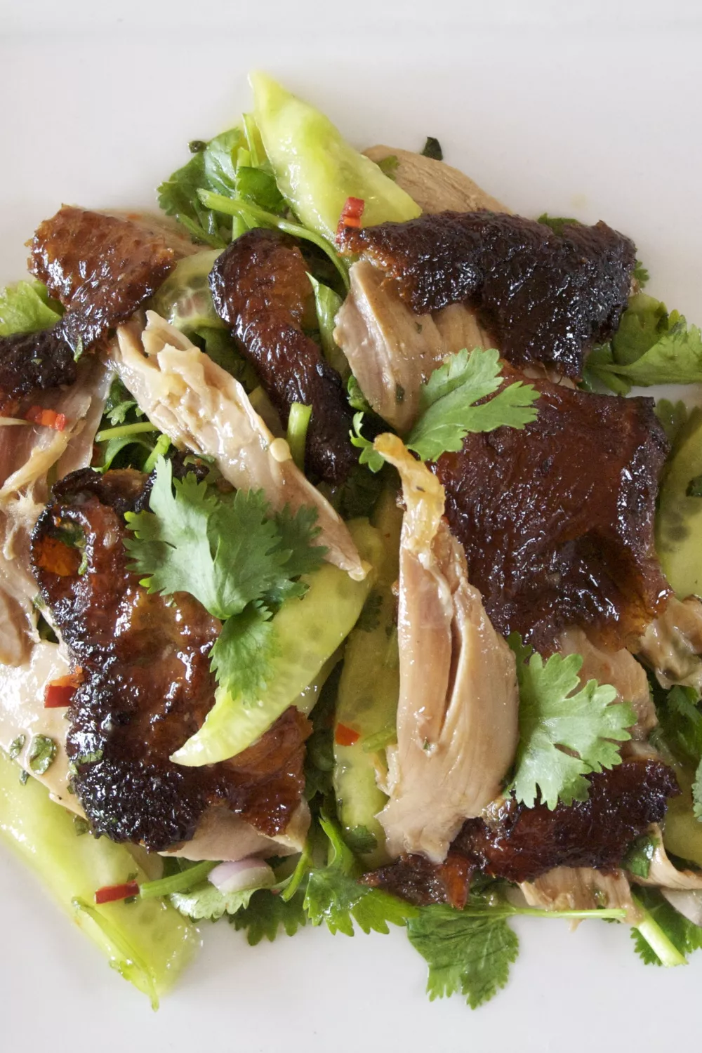 Frisse kruidensalade met sappige pekingeend en een pittige Aziatische dressing van zoetzure chilisaus en vissaus. Komkommer, munt, koriander en geraspte gember geven een zomerse crunch en aromatische frisheid, terwijl het vlees kort wordt opgewarmd in de oven en het vel knapperig gegrild. Perfect als licht hoofdgerecht voor warme dagen of als smaakvol gerecht bij een informele borrel.