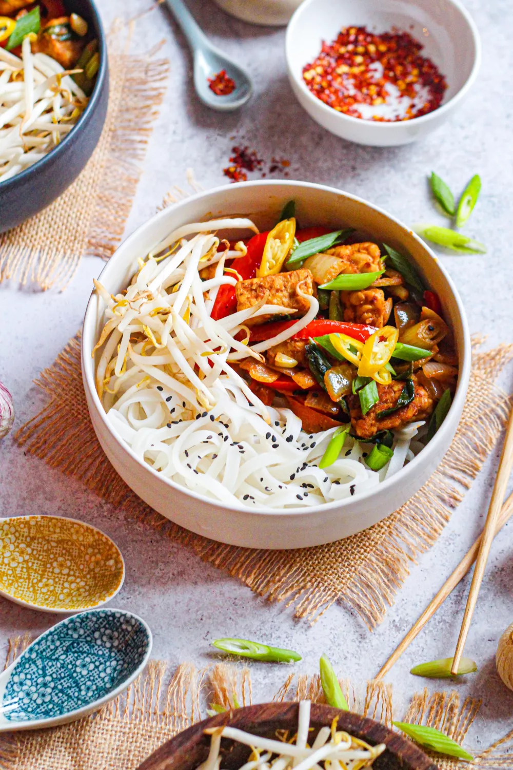 Verdeel de rijstnoedels, groenten, tempeh en de saus over de diepe borden en maak het af met de gele peper, extra lente-ui, sojascheuten en zwart sesamzaad. Wil je het nog wat pittiger maken? Verdeel dan wat chilivlokken over de saus.