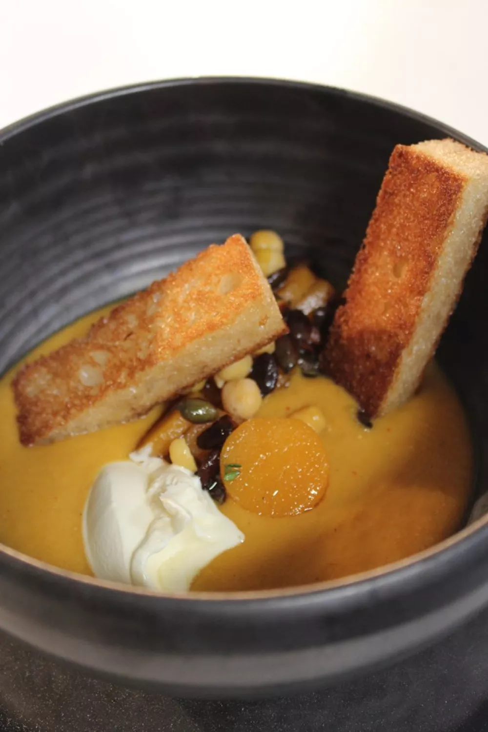 Deze kruidige pompoensoep met kikkererwten combineert romige butternut met verwarmende chermoula en gerookt paprikapoeder tot een troostrijke herfstsoep. Door de groenten zacht te stoven en alles glad te pureren ontstaat een fluweelachtige textuur die je afwerkt met geblancheerde pompoenblokjes, krokante broodsoldaatjes en geroosterde pompoenpitjes. Perfect als stevige lunch of gezellig voorgerecht bij een kille avond, met een lepeltje zure room en een scheutje limoensap voor frisse tegenhanger.