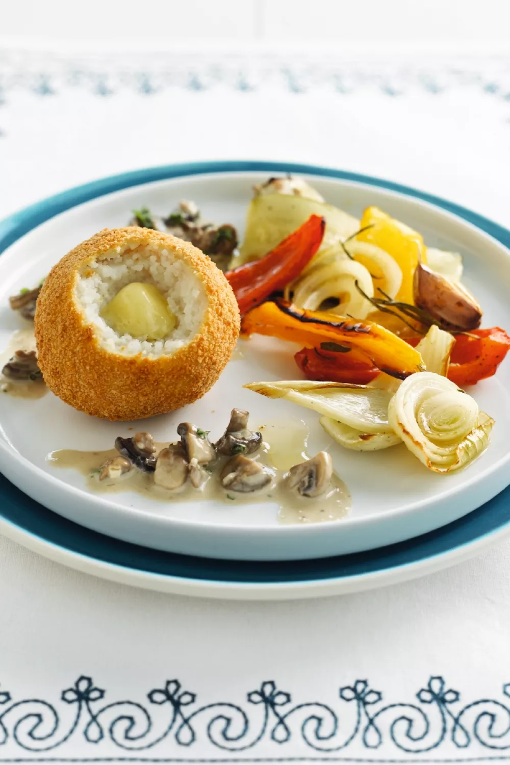 Kruidige rijstballetjes met een smeuïge Emmental in het hart zijn een knapperige traktatie voor borrels, feestjes of een gezellige herfstavond. Langkorrelrijst wordt zachtjes in bouillon gaargekookt, afgekoeld, gevormd en gepaneerd met bloem, ei en paneermeel. Kort frituren geeft een goudbruine korst en een romige kaasmelange binnenin.