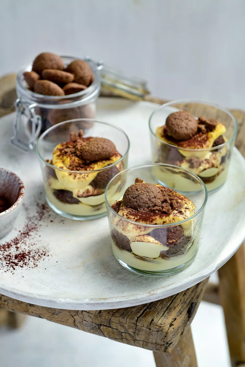 Zet de tiramisuglaasjes enkele uurtjes in de koelkast om op te stijven en werk ze nog af met een laagje cacaopoeder en extra kruidenoten alvorens te serveren.