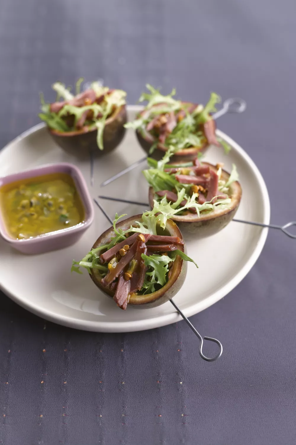 Prik de passievruchtkuipjes op een stokje vul met sla, eendeborst en strooi er geroosterde boekweit over. Serveer met de dressing.