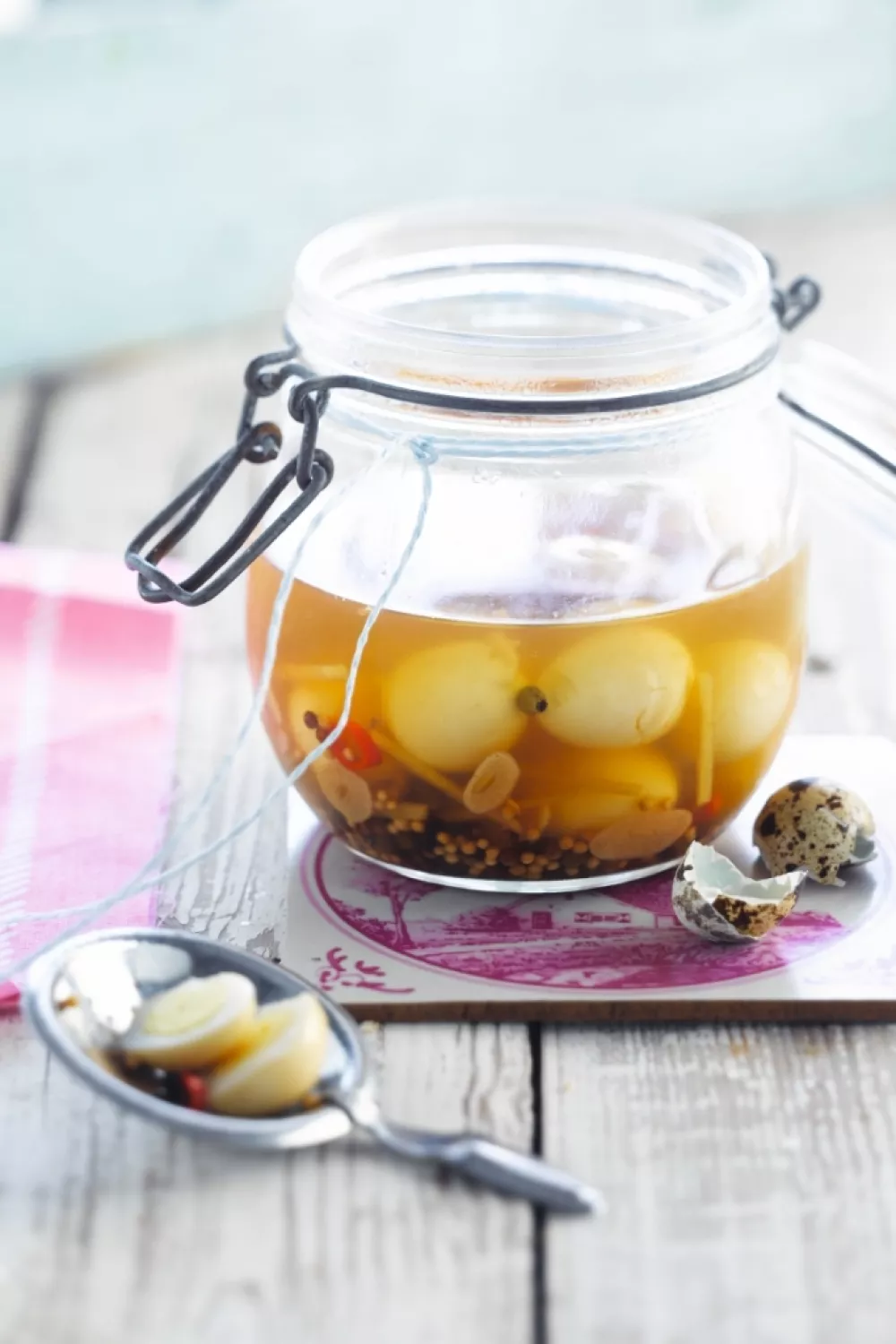 Frisse, pittige kwarteleitjes op zuur zijn een heerlijk borrelhapje of licht bijgerecht voor zomerse picknicks en winterse borrels. Met witte wijnazijn, gember, korianderzaad, mosterdzaad, knoflook en groene peperkorrels krijgt elk eitje een kruidige, licht pikante smaak; hard koken en inmaken is voldoende. Hoe langer ze rusten in de inmaakpot, hoe intenser de smaak en hoe langer ze houdbaar blijven.