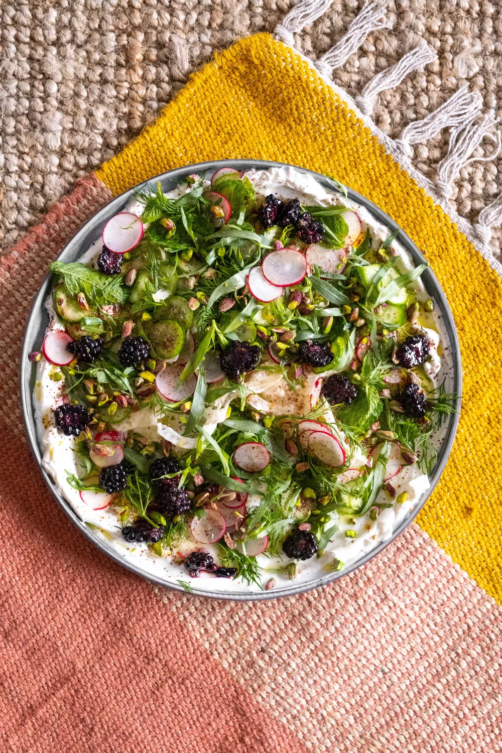Doe de labneh in een schaal en verdeel er de groentjes over. Werk nog af met de groene kruiden, sumac, bramen en een scheut olijfolie.