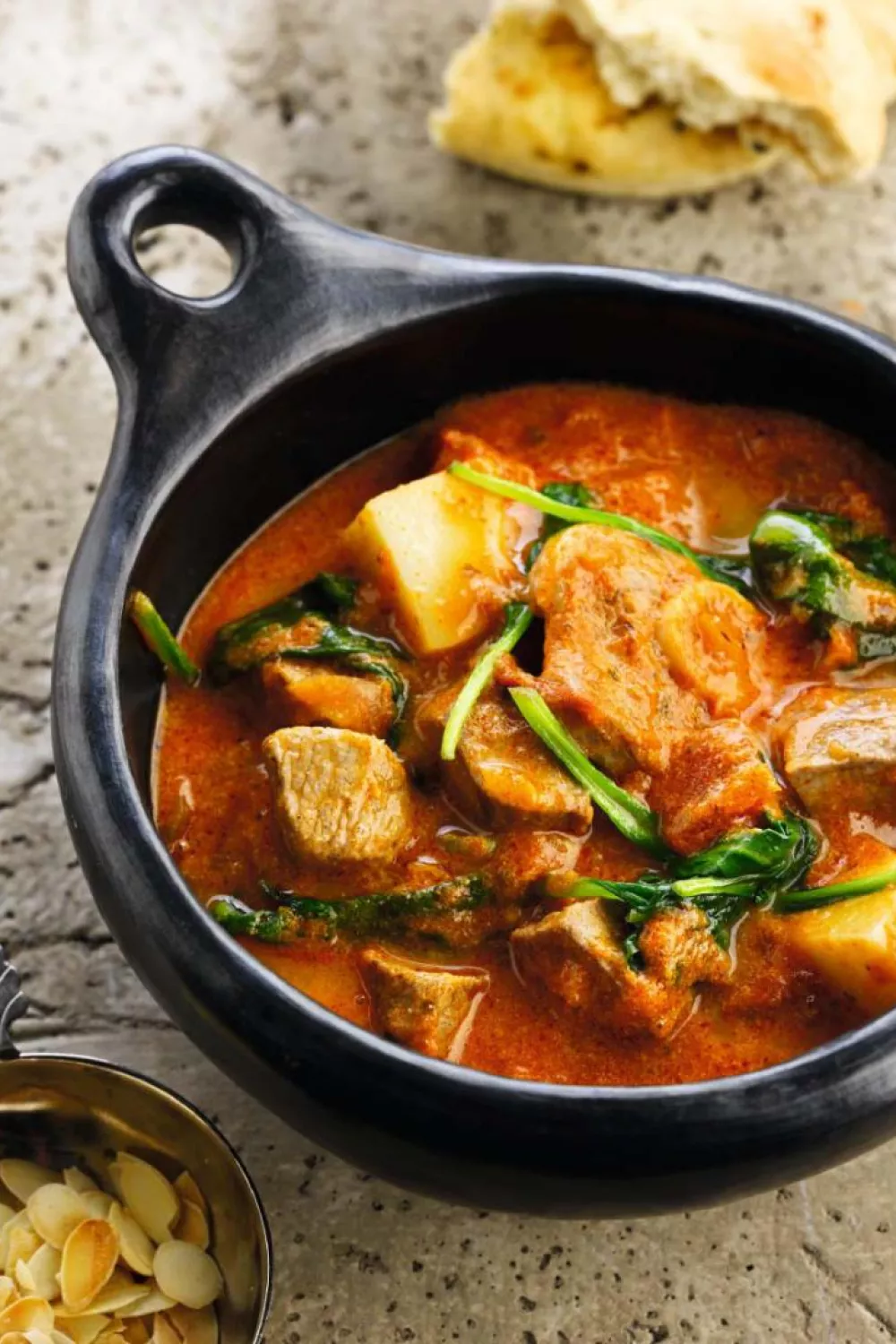 Deze kruidige lamscurry met malse lamschenkel, tomaten en rode currypasta is een verwarmend stoofgerecht voor herfst en winter. Aardappelen geven body, verse spinazie zorgt voor frisheid en geroosterde amandelen voegen een knapperige toets toe. Door het aanbakken en zachtjes sudderen ontwikkelen zich diepe, rijke smaken; serveer met naanbrood voor een gezellig familiediner.