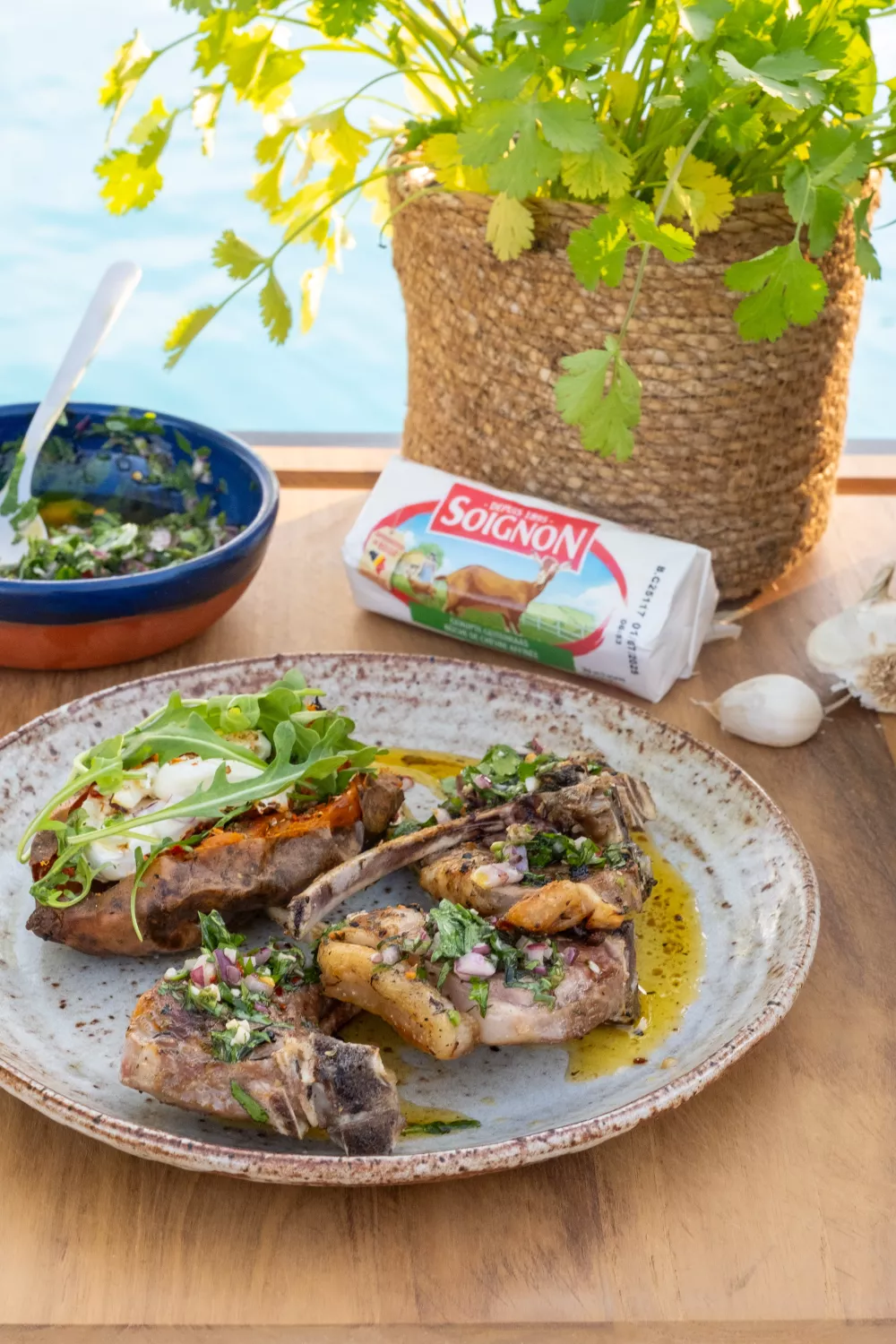Wrijf de koteletjes in met de chimichurri kruiden en olijfolie. Grill ze kort en krachtig op de BBQ tot ze mooi rosé gebakken zijn (2 à 3 min per kant, afhankelijk van dikte). Laat kort rusten.