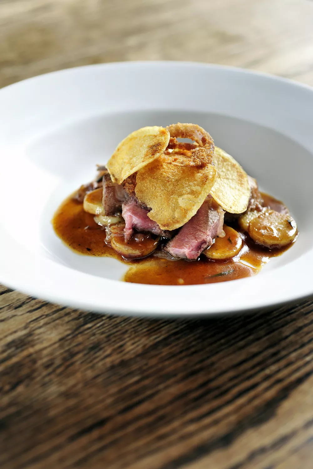 Snij de overgebleven aardappel in flinterdunne schijfjes. Frituur ze op 180°C tot goudkleurige chips. Laat ze uitlekken op een keukendoek. Snij de ui in ringen. Draai een paar mooie ringen eerst in de melk en daarna in het paneermeel. Bak de ringen goudgeel in de frituur. Schep de groentjes uit de pan. Bind de saus met een klontje boter. Snij het vlees van de beentjes. Zout het nog even bij.