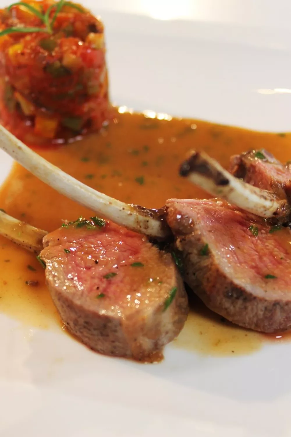 Een feestelijk hoofdgerecht met sappige lamsribstukken, romige aardappelgratin en een kleurrijke ratatouille van paprika, courgette en aubergine. Het vlees wordt eerst dichtgeschroeid en kort in de oven gegaard, terwijl lamsbeenderen inkoken tot een smaakvolle jus. Ideaal voor een zomeravond of weekendmaal met Franse technieken als stoven en gratineren.