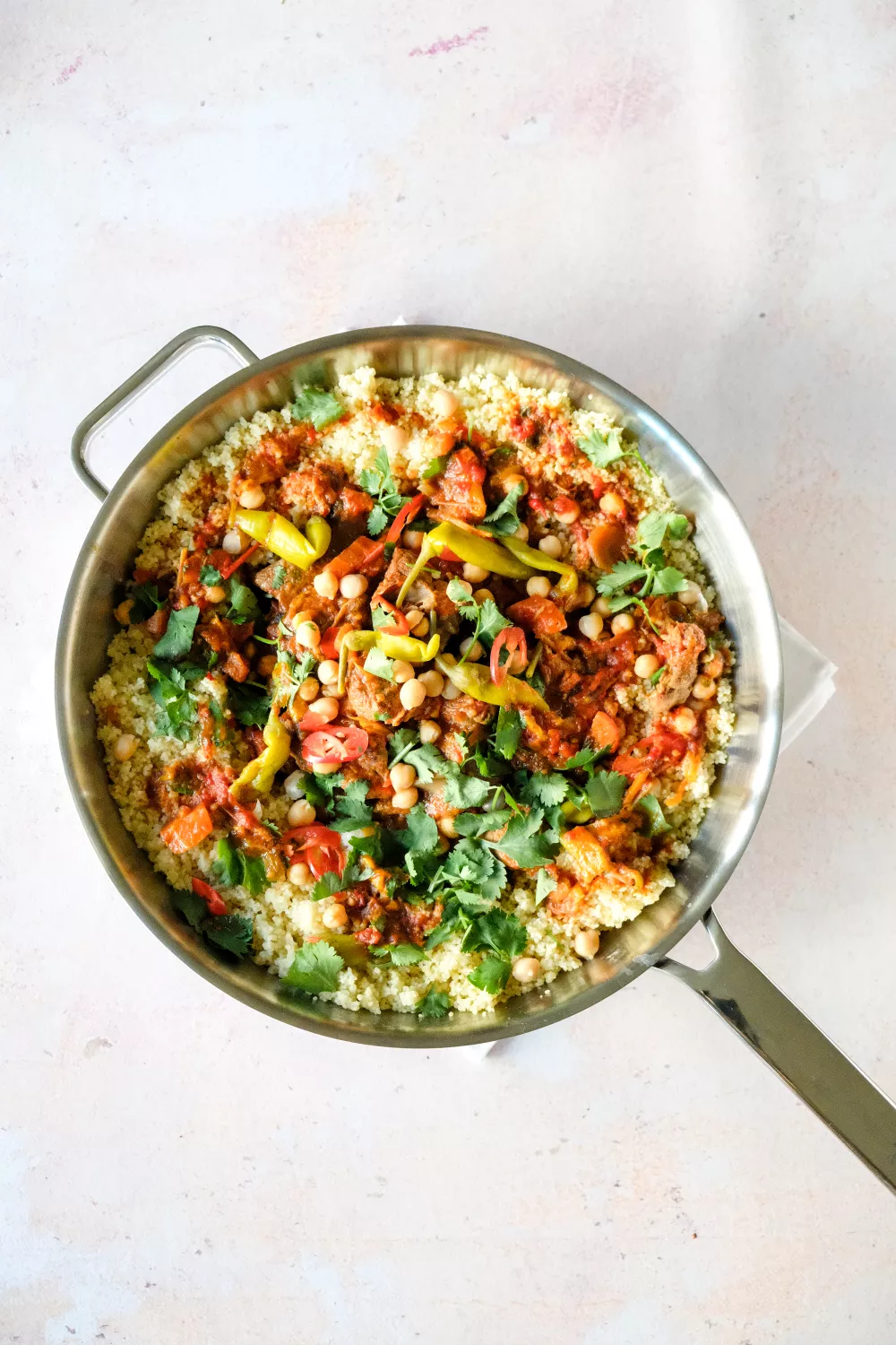 Deze hartige lamsstoverij met couscous combineert langzaam gestoofd lamsvlees met zoete tomaat, paprika en wortel en een pittige toets van chili en koriander voor een warme, kruidige smaak. De stoofmethode met lamsfond geeft een rijke, gebonden saus, aangevuld met kikkererwten voor bite. Perfect als winterse gezinsmaaltijd of voor een gezellige weekendmaaltijd met vrienden.