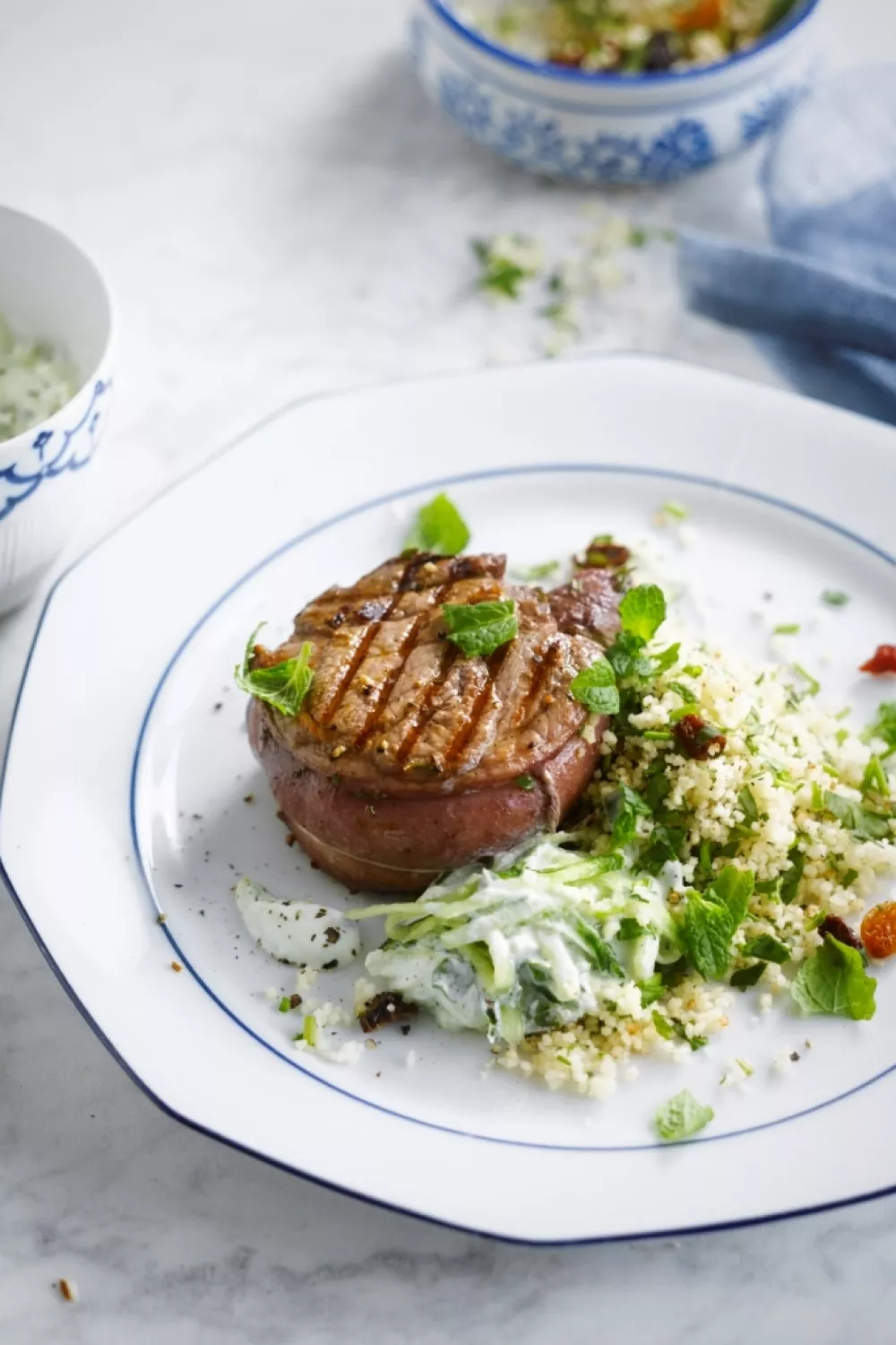 Serveer het vlees met de couscous en de komkommeryoghurt.