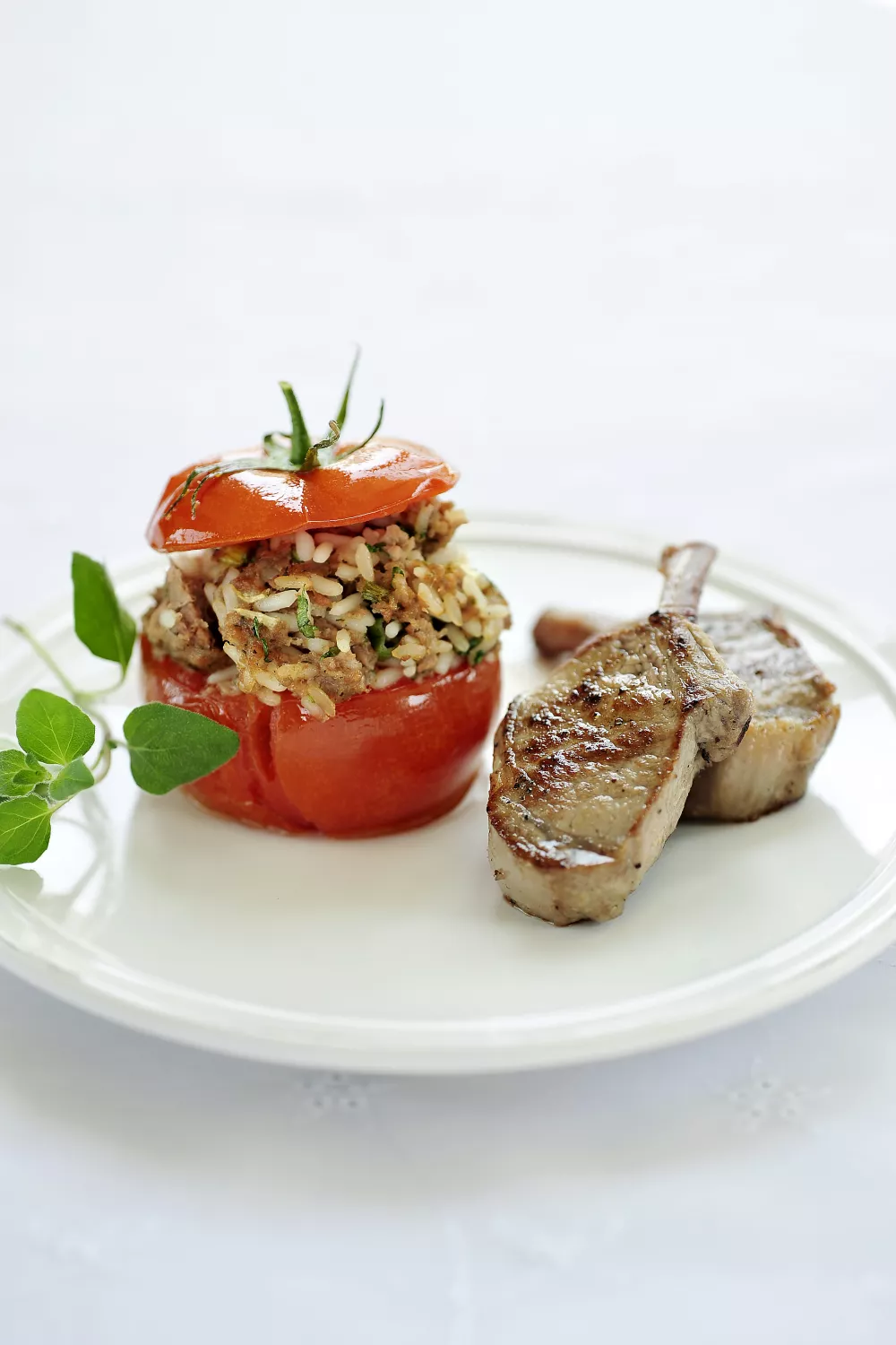 Vul de tomaten op met het mengsel van gehakt en rijst, zet de dekseltjes er terug op en giet er een klein beetje olijfolie over. Zet ze gedurende een uurtje in de oven in een ovenschaal met wat olie. Wanneer de tomaatjes nog ongeveer 20 minuutjes nodig hebben, bak je de lamsribstukjes mooi bruin aan alle kanten. Kruid met peper en zout en eventueel een beetje oregano en zet ze mee in de oven. Houd het lam goed in de gaten zodat het zeker rosé blijft. Normaal gezien (afhankelijk van de dikte van de lamsribstukjes) zou alles samen warm en gaar moeten zijn.