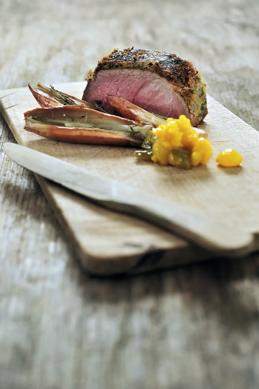 Knapperig gepaneerd lamszieltje met een geurige persillade van peterselie en broodkruim, geserveerd met in ganzenvet gekonfijte sjalotten en frisse pickles. Het vlees wordt eerst aangebraden voor een goudbruin korstje en daarna kort verder gegaard in de oven tot rosé, terwijl de sjalotten zacht karamelliseren in folie. Perfect voor een feestelijk herfst- of winterdiner vol rijke en frisse smaken.