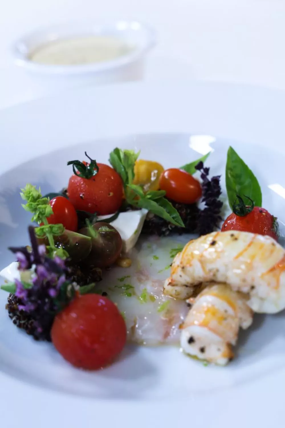 Lichte, feestelijke quinoasalade met zachte burrata en verfijnde carpaccio van langoustines, een smaakvol samenspel van zee en mediterraan. Gekonfijte kerstomaatjes, geroosterde pijnboompitten en rozijnen geven zoetheid en textuur, terwijl kort gebakken langoustines en een romige sesammayonaise voor umami en frisheid zorgen. Perfect als zomerse lunch of luchtig voorgerecht bij een lentes diner, met confijten, roosteren en carpaccio voor een verfijnde presentatie.