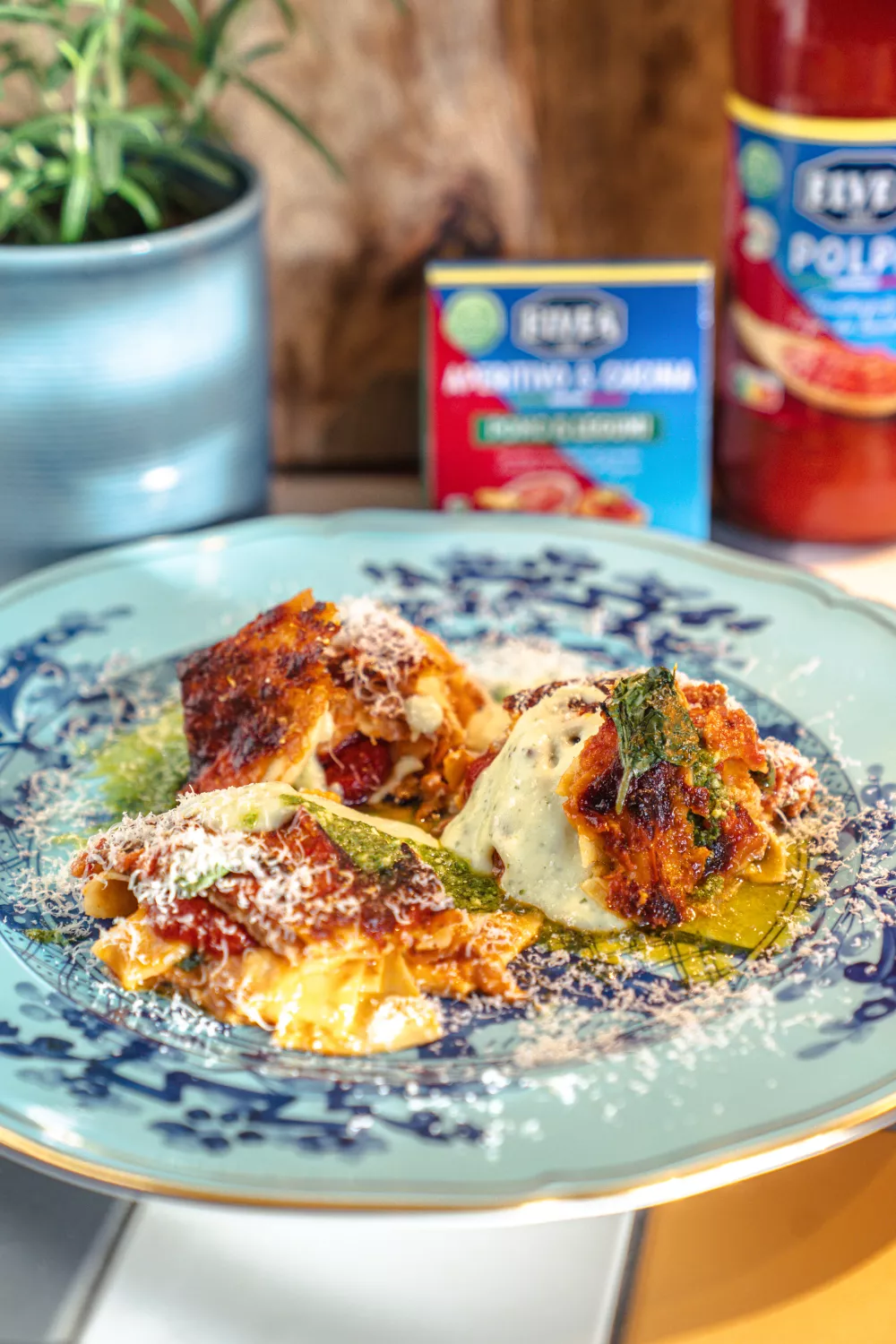 Lasagne met rundsragout en crème van Parmezaanse kaas