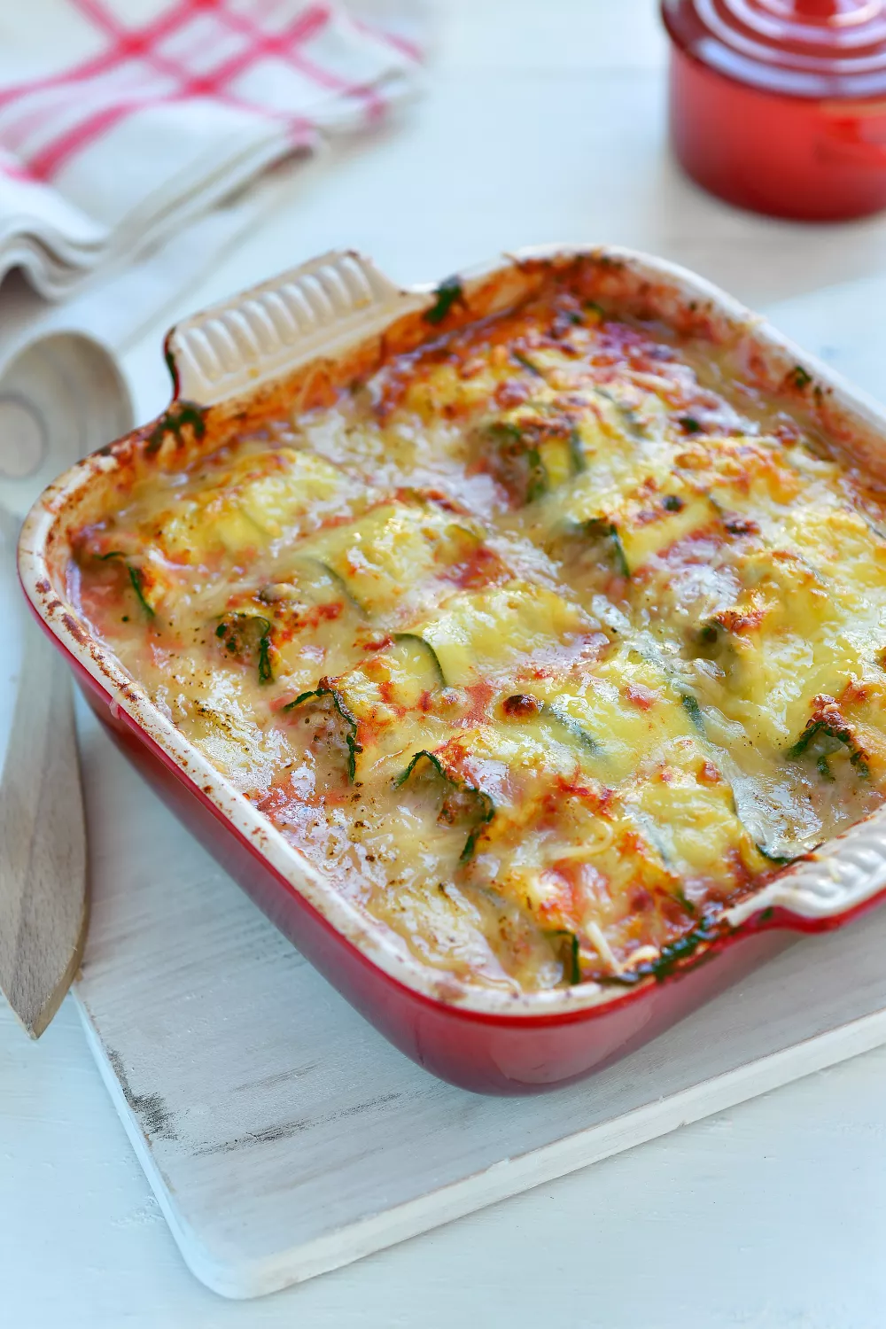 Lasagne van courgetterolletjes combineert sappig gehakt en romige ricotta met verse basilicum en een rijke tomatensaus tot een lichte, Italiaanse ovenschotel zonder pastavellen. Dun geschaafde courgette wordt gevuld en opgerold en daarna gebakken onder een goudbruin kaaskorstje, ideaal voor een zomers familiediner of doordeweekse maaltijd. Simpel, smaakvol en een fijne koolhydraatarme twist op traditionele lasagne.