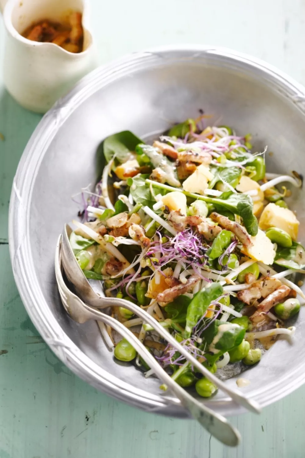 Lauwwarme tuinbonensalade met knapperige spekreepjes, jonge bladspinazie en brokjes oude kaas biedt een frisse maar hartige smaakcombinatie die ideaal is voor lente en zomer. De tuinbonen worden kort geblancheerd en gepeld, vervolgens gemengd met sojascheuten en overgoten met een romige saus van room, mosterd en sojasaus die ontstaat door het spek te bakken en de aanbaksels te blussen. Perfect als lichte lunch of bijgerecht bij een informeel etentje, geserveerd met vers brood.