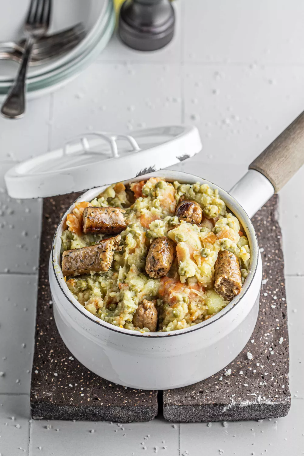 Deze lentehutsepot met vegan worst is een hartverwarmend stamppotgerecht dat frisse wortelen, bloemige aardappelen en zoete erwtjes samenbrengt. De aardappelen en wortels kook je en prak je grof, terwijl ui en erwtjes licht worden gebakken en de gebakken vegan worst een hartige, vullende toets geeft. Met bakmargarine, mosterd en een snuf nootmuskaat zet je snel een gezellig voorjaars of doordeweeks familiediner op tafel.