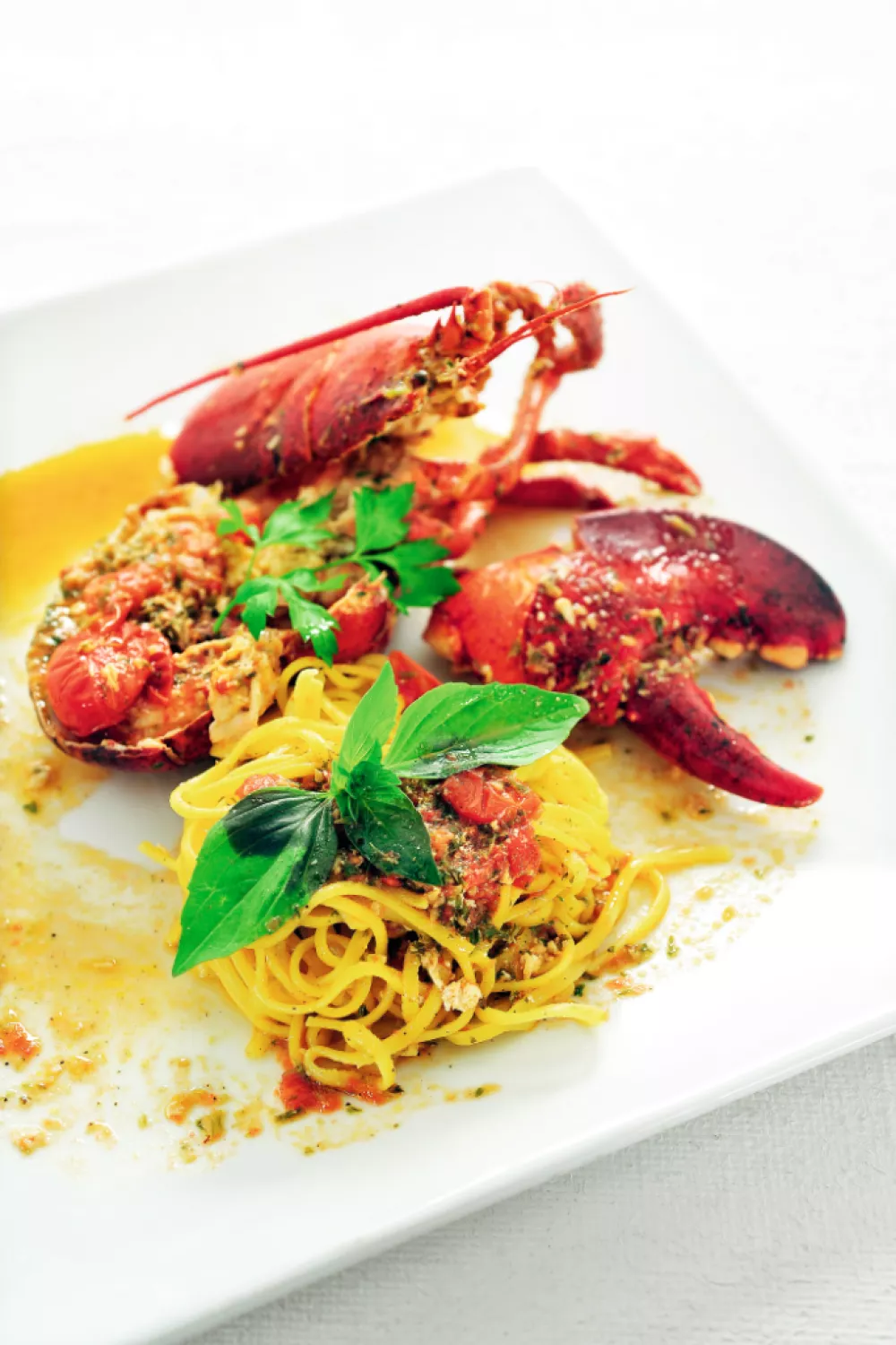 Schik de kreeft op voorverwarmde borden en serveer met de pasta. Werk af met basilicum, olie en peper.