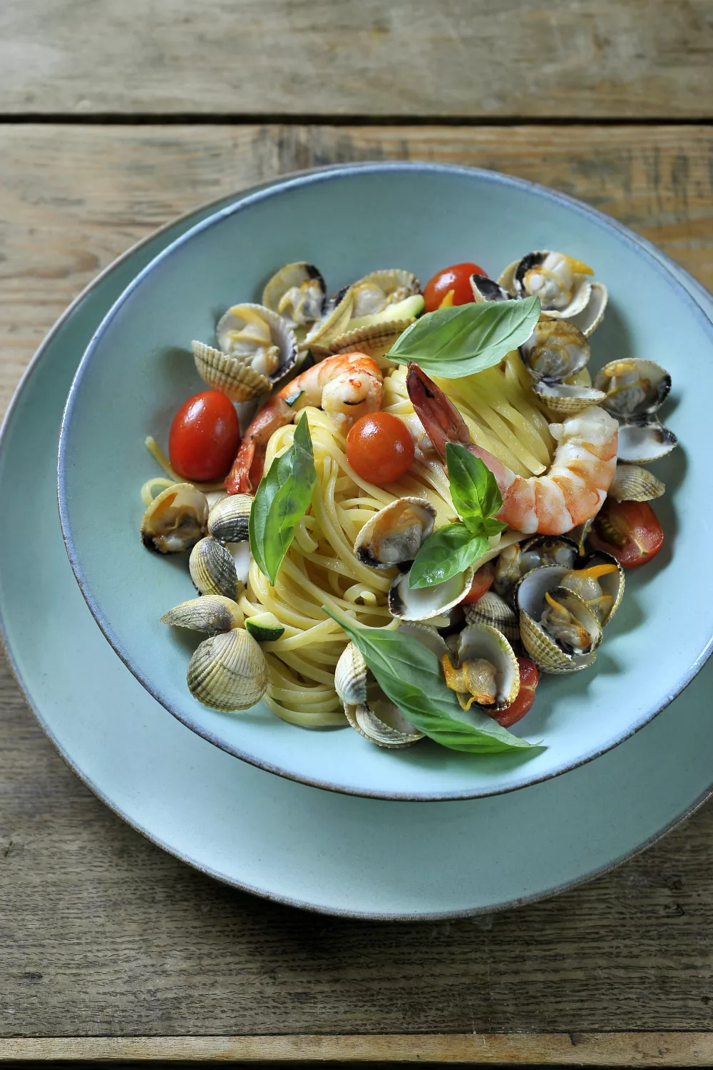 Lichte zeevruchtenpasta met zelfgemaakte linguine en sappige venusschelpen, malse rode gamba's, courgette en zoete kerstomaatjes. Het pastadeeg wordt snel uitgerold, de schelpdieren en garnalen worden in knoflook en witte wijn gestoofd en alles wordt op het laatste moment met de pasta gemengd zodat de smaken fris blijven en het geheel al dente is. Perfect voor een zomerse avond of een snel, smaakvol visdiner door de week.